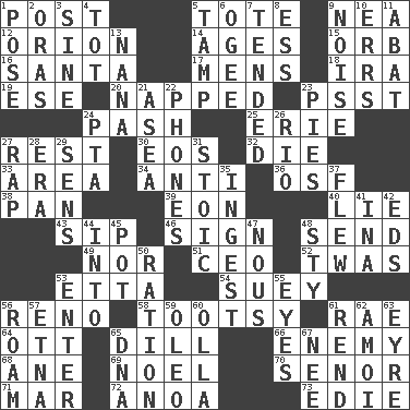 ACROSS 1. Mail 5. Carry 9. Teachers' org. 12. Constellation of myth 14. Ripens 15. Globe 16. Before Barbara or Clara 17. Not women's 18. Lyricist Gershwin 19. Compass dir. 20. Slept 23. Inconspicuous attention getter 24. Romantic infatuation 25. 4th largest of the Great Lakes 27. Take ten 30. Greek goddess of the dawn 32. Pass on 33. Length times width 34. Opposed to 36. Order of Saint Francis (abbr.) 38. Baking dish 39. Period of immesurable duration 40. Whopper 43. Small drink 46. Public display of a written message 48. Transmit 49. And not 51. Corporate head (abbr.) 52. It was, poetically 53. Singer James 54. Chop _ 56. Western Nevada city 58. A girl or young woman (variant) 61. Actress Charlotte 64. Baseball player Mel 65. Deli pickle 66. Foe 68. One (Scot) 69. Christmas carol 70. Sir (Sp.) 71. Make imperfect 72. Small Philippine buffalo 73. Singer Brickell DOWN 1. Introduce or present, as a question 2. Mouths or openings 3. Trig term 4. Small child 5. Pack (down) 6. Double curve, resembling the letter S 7. Looked after 8. Double-curved letter 9. Annoying sound 10. Blunders 11. Blind as ____ 13. Grandmother 21. At sea 22. Gives a jingle 23. Sliced desserts 24. Parent Teacher Association (abbr.) 26. _ de Janeiro 27. Strike 28. Period 29. Elected reps. 31. Unemotional 35. Swallow 37. Soared 41. _ tizzy (2 wds.) 42. Begley and Asner 44. To the inside or interior of 45. Plant holder 47. Horse sense 48. Filthy place 50. Food allowance for one day 53. Keyboard key 55. Snake ____ (dice throw) 56. Wander aimlessly 57. Inactive volcano in Sicily 59. Margarine 60. Spanish pot 61. Tear apart 62. Mine, in Marseilles 63. Jane of fiction 65. Heredity factor (abbr.) 67. Born