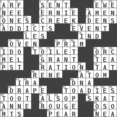 ACROSS 1. Sandy's bark 4. Posted 8. She-sheep 11. Born 12. Bert's buddy 14. So be it 15. Washington bills 17. Small stream 18. Hiding places for outlaws 19. Inveterate users 21. Happening 23. French article 24. Working for oneself (abbr.) 25. Baking chamber 27. Demure 30. Wedding promise 31. Bathroom plumbing fixture 34. The grampus (Milton) 37. Cartoonist voice _ Blanc 38. Let have 39. Afternoon social gathering 40. Pacific Standard Time (abbr.) 41. Food allowance for one day 43. Make lace 44. French philosopher Descartes 45. Smallest unit of an element 47. Lyricist Gershwin 49. Heredity factor (abbr.) 50. Window treatment 52. Sycophants 56. A blast of a horn 57. Columnist Joseph or Stewart 60. Three-handed card game 61. Singer Murray 62. Makeup applied to the cheeks 63. Bear (Spanish) 64. Mountains (abbr.) 65. Lightbulb-shaped fruit 66. Teachers' org. DOWN 1. Small Philippine buffalo 2. Tear apart 3. Nourish 4. Religious groups 5. Blunders 6. Compass dir. 7. Make a knot 8. Make improvements or corrections to 9. Gone 10. Followers of ems 13. Supplement with great effort 14. An important port of Yemen 16. Filth; sediment 20. Penny 22. Zeal 25. Lyric poems 26. Electrical Unit 27. Food holder 28. Painter Guido (1575-1642) 29. "Tell ____ the Marines!" 30. Naughty child 32. Legendary monster 33. SW Asia republic 34. Von Bismarck 35. 480, 500 or 516 sheets of paper 36. Feline 42. Nanny 44. Strike 46. Bits 47. Metal shackles 48. Pace 49. Drug addict 50. Do not 51. Hearing organ 52. Ancient Roman robe 53. Image 54. Comfort 55. Portico 56. Scottish cap 58. Chop off 59. Take to court