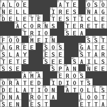 ACROSS 1. Medicinal plant 5. Had dinner 8. Bear (Spanish) 11. 1994 drama film starring Jodie Foster 12. Angers 13. Tired old horse 14. Erase 17. A testis 19. Oak nuts 21. Cigar-shaped 22. Musical group of three 23. Ocean 24. Egg _ yung 27. Chow _ 29. Fast jet (abbr.) 32. Match 34. Distress signal 36. Yard entry 37. Kill 38. Compass dir. 39. Play the lead 40. Wig 41. Perceive with the eye 42. Moves on water 43. Compass dir. 44. Connect, as a bridge 46. Born 47. Nanny (var.) 50. Greek god of love 52. Spoke pompously 55. Foolish or stupid persons 57. Conveyance 59. Ringlike coral islands and reefs 62. Heredity factor (abbr.) 63. Roll call or roster of names 64. Plunder 65. Elected rep. 66. Eastern Standard Time (abbr.) 67. Singer James DOWN 1. Added to 2. Area sheltered from the wind 3. Water jar 4. Voters do this 5. "We ___ not amused" (Victoria) 6. Trials 7. First name in cosmetics 8. Single time 9. Table seasoning 10. Double curve, resembling the letter S 12. ___ a Wonderful Life 15. Singer Mel 16. One of the Great Lakes 18. Lyricist Gershwin 20. Annoying sounds 24. Goes without food and/or water 25. Stares at amorously 26. Speak pompously 28. Olfactory organs 29. Smooth fabric 30. Having lost freshness 31. Laconic 33. Sight organ 35. Oozed 36. Girls' org. (abbr.) 42. Snout, nose 45. Roberta Peters solo 47. _ moment's notice (2 wds.) 48. Distance measurement (Brit.) 49. Goodbye (Sp.) 51. Fur scarf 52. Likelihood 53. French philosopher Descartes 54. Actor Alda or Thicke 55. _ tizzy (2 wds.) 56. Position in a hierarchy or organization 58. Baseball player Mel 60. Car dealer's back yard 61. R.R. building