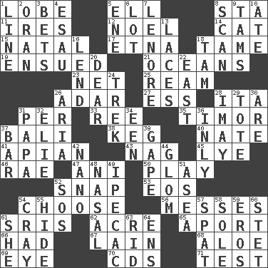ACROSS 1. Ear part 5. Pipe bend 8. R.R. building 11. Angers 12. Christmas carol 14. Domesticated feline 15. Brizilian seaport 17. Inactive volcano in Sicily 18. Docile 19. Took place subsequently 21. Seas 23. Remaining after all deductions 25. 480, 500 or 516 sheets of paper 26. The sixth month of the Jewish calendar 27. Double-curved letter 28. Call ___ day 31. For each 33. To riddle 35. The easternmost of the Lesser Sundas 37. Indonesian resort city 38. Barrel 40. Nathan's nickname 41. Bee-related 43. Tired old horse 45. Potassium hydroxide 46. Actress Charlotte 47. Cuckoo 50. Frolic 52. Fastener 53. Greek goddess of the dawn 54. Opt 56. Makes clutter 61. Indian titles of respect 62. 43,560 square feet 65. To the left, to Queeg 66. Possessed 67. (Had) reclined 68. Medicinal plant 69. Sight organ 70. Music discs 71. Trial DOWN 1. Actor's bit 2. NW Algerian seaport 3. Antes 4. Son of Isaac 5. Compass dir. 6. Car dealer's back yard 7. Poe poem 8. Skim 9. Scottish caps 10. Had dinner 13. Shoestrings 16. Grant temporary use of 18. Scottish cap 20. Letter starter 22. Compass direction 24. Long journey 26. Roberta Peters solo 28. "If ____ say so..." 29. Carry 30. "We ___ not amused" (Victoria) 31. Dad 32. Writer Wiesel 34. Car or cant ending 36. In an inward manner 37. Soap unit 39. Stare wonderingly 42. Billionth: prefix 44. Take by theft 48. Rhinal 49. Medicinal drug used to evoke vomiting 51. Toward the sea 52. Mayday 54. Supercomputer manufacturer 55. Flintstone garb 57. Petty quarrel 58. Flatfish 59. Greek god of love 60. Proofreading order 61. A female animal or person 63. To free from 64. Followers of ems