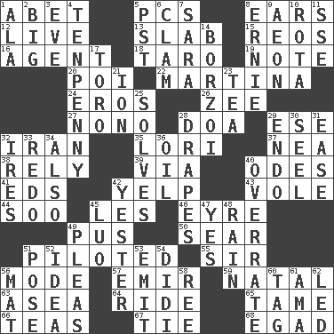 ACROSS 1. Collude with 5. Personal Computers (abbr.) 8. Hearing organs 12. Not recorded 13. Broad, flat, thick piece 15. Vintage cars 16. Rep 18. Pacific island yam 19. Brief written record 20. Luau course 22. Chrissie's court nemesis 24. Greek god of love 26. Last letter of the English alphabet 27. Words to Nanette 28. ___ good deed 29. Compass dir. 32. SW Asia republic 35. Australian parrot (variant) 37. Teachers' org. 38. Trust 39. By way of 40. Lyric poems 41. Begley and Asner 42. Sharp bark 43. Short-tailed, large-bodied rat 44. "Barney Miller" actor Jack 45. French article 46. Jane of fiction 49. Fluid product of inflammation 50. Scorch 51. Manned the helm 55. Title for a knight 56. Method 57. Independent ruler or chieftain 59. Relating to or accompanying birth 63. At sea 64. Travel on an animal 65. Not wild 66. Afternoon social gatherings 67. Make a knot 68. Mild oath DOWN 1. Wing 2. Of large size 3. First lady 4. 3-inch nail 5. Pacific Standard Time (abbr.) 6. Burrowing marine mollusk 7. "Two Mules for Sister ____" 8. Bert's buddy 9. Period of immesurable duration 10. Round or rotation of duties 11. Compass dir. 14. Tall fast-moving dog breed 17. "Corrida" creature 21. Electrically charged atom 23. Beverage made from leaves 25. Finds the solution 28. Window treatments 29. Inside; within (prefix) 30. Sew up the eyelids of hawks and falcons 31. Comfort 32. Angers 33. Redecorate 34. In addition 36. Lubricate 40. Make much ado about nothing 42. Last past 45. Nilotic language 47. Affirmative reply 48. Precipitation 49. Entreaties 51. Introduce or present, as a question 52. The content of cognition 53. Send forth 54. "You Light Up My Life" star Conn 56. Floor covering 58. To sift 60. Label 61. Nanny (var.) 62. Directed