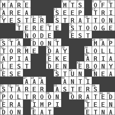 ACROSS 1. Female horse 5. Mountains (abbr.) 8. Often (poetically) 11. Type of rug 12. Ooze 13. Three (prefix) 14. Of or pertaining to yesterday 17. Ski resort town in Vermont 19. Cylindrical with tapered ends 21. Moe Howard, for one 22. Connecting point 23. Eastern Standard Time (abbr.) 24. R.R. building 27. Do not 29. Atlas unit 32. Singer Mel 34. 24 hours 36. Hang loosely or laxly 37. Capital of Western Samoa 38. Make supply last 39. Roberta Peters solo 40. For fear that 41. Lair 42. Black 43. Compass dir. 44. Make senseless or dizzy 46. Teachers' org. 47. American Automobile Association (abbr.) 50. Against 52. A viewer who gazes fixedly 55. Michaelmas daisies 57. Coward 59. Declaimed 62. Period 63. Body of Kaffir warriors 64. Adolescent 65. Spanish title 66. Ingest 67. Inactive volcano in Sicily DOWN 1. Can I? 2. "We ___ not amused" (Victoria) 3. Repose 4. Eroded 5. Was introduced to 6. Laconic 7. Arguments over trivial matters 8. "Beetle Bailey" pooch 9. Tree-dwelling hopper 10. Prong on a fork 12. Compass dir. 15. Eat (away) 16. Redecorate 18. Small child 20. Watched over 24. Lacking originality or spontaneity 25. Drinks excessively 26. Ascend 28. Proceeds 29. Person of subnormal intelligence 30. Place in a line 31. Beach, in Buenos Aires 33. Floor covering 35. Gossips 36. Experiment locale 42. Keyboard key 45. To (old English) 47. Nonscientific branch of learning 48. Nest on high 49. Scent 51. Feeling or showing extreme anger 52. Hurried 53. "Corrida" creature 54. ____ Jay Lerner 55. Black tropical American cuckoo 56. Proofreading order 58. Elect 60. Car or cant ending 61. Heredity factor (abbr.)