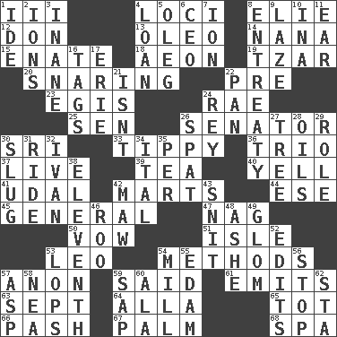 ACROSS 1. One more than two 4. Event scenes 8. Writer Wiesel 12. Spanish title 13. Butter sub 14. Grandmother 15. Maternal 18. A really long time 19. Russian ruler 20. Catching in a trap 22. Before (prefix) 23. The front part of a cuirass 24. Actress Charlotte 25. Elected rep. 26. Elected representative 30. Indian title of respect (Mr.) 33. Likely to tip or tilt 36. Musical group of three 37. Not recorded 39. Beverage made from leaves 40. Shout 41. Hereditary estate 42. Shops 44. Compass dir. 45. Commissioned military rank 47. Tired old horse 50. Promise 51. Capri or Wight 53. Lion 54. Modes 57. Soon (poet.) 59. Alleged 61. Gives off 63. Back-to-school mo. 64. Silent film actress Nazimova 65. Small child 66. Romantic infatuation 67. Inside of hand 68. Health resort DOWN 1. Binary compound 2. Charged particles 3. Lacking in sense or substance 4. Grant temporary use of 5. Cassini of fashion 6. Corporate head (abbr.) 7. Electrically charged atom 8. Plea 9. Goldbrick 10. _ tizzy (2 wds.) 11. Hearing organ 16. Labels 17. One of the Great Lakes 21. Is not 22. Baking dish 24. Marina Del _, California 26. Argument over a trivial matter 27. Family _ (genealogy) 28. Lubricates 29. Hero or heavy, e.g. 30. Strike heavily 31. Travel on an animal 32. _ the terrible 34. Slanted text style (abbr.) 35. For each 38. Veterans Day date 42. Informal term for the mouth 43. In a ____ (agitated or irritated) 46. Friend of Pooh 48. American tennis player Robert 49. Seize upon or latch onto something 52. Proofreads 53. Chops off 54. Place where flour is made 55. Dutch treat 56. Constrict 57. Viper 58. Teachers' org. 59. Plant excrement 60. Wing 62. R.R. building