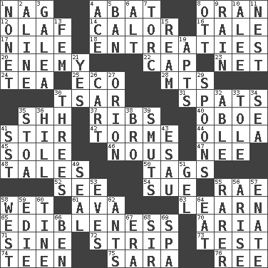 ACROSS 1. Tired old horse 4. Blind as ____ 8. NW Algerian seaport 12. Norwegian king 14. Bodily heat indicating an inflammation 16. Story 17. "Death on the ____" 18. Pleas 20. Foe 22. Head covering 23. Fish or hair follower 24. Beverage made from leaves 25. Environmental prefix 28. Mountains (abbr.) 30. Russian ruler of old 31. Arguments over trivial matters 35. Quiet! 37. Teases 40. Mitch Miller's instrument 41. Agitate 42. Singer Mel 44. Water jar 45. Flatfish 46. Good sense 47. Born 48. Falsehoods 50. Labels 52. Perceive with the eye 54. Take to court 55. Actress Charlotte 58. Dripping 61. Actress Gardner 63. Acquire or gain knowledge or skills 65. The property of being fit to eat 70. Roberta Peters solo 71. Trig term 72. Empty completely 73. Trial 74. Adolescent 75. "Two Mules for Sister ____" 76. To sift DOWN 1. Music written for nine 2. Place in a line 3. An organ shaped like a helmet 4. Adept person 5. Prohibit 6. The first octave above the treble staff 7. Torque (variant) 8. Baseball player Mel 9. Water falling in drops from the sky 10. Toward shelter 11. Egg locale 13. Opposite of masc. 15. 480, 500 or 516 sheets of paper 19. Flats, for short 21. It is so 26. Draw slowly or heavily 27. Greek mythologigal hunter 29. Soup utensils 30. Trios 32. Competent 33. Lacquered or enameled metalware 34. Ocean 35. Portico 36. Land elevation 38. Sis' sibling 39. Obscenities 41. Fast jet (abbr.) 43. He sold his birthright 49. Lick closed 51. Set 53. Nights before holidays 55. More valued for its uncommonness 56. Get up 57. Maternal 58. 270 degrees 59. Singer Brickell 60. Prong on a fork 62. Pismires 64. Ingest 66. Benjamin's nick name 67. Period 68. Title for a knight 69. Health resort