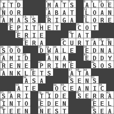 ACROSS 1. It would 4. Floor coverings 8. _ vera 12. Not either 13. Blind as ____ 14. Grant temporary use of 15. Collect or gather 18. Port city in Latvia 19. Old wives' tales, e.g. 20. Curse 22. Small bed 23. 4th largest of the Great Lakes 24. Make lace 25. Epoch 26. Window treatment 30. "Barney Miller" actor Jack 33. A sleeping potion; an opiate (poet.) 36. Pulitzer Prize-winning author Ferber 37. Among 39. Santa ___, CA 40. Whirlpool 41. French philosopher Descartes 42. A-one 44. Distress signal 45. Short socks 47. _ moment's notice (2 wds.) 50. White ___ sheet 51. Elected reps. 53. Had dinner 54. Pertaining to the sea 57. Indian skirt 59. Event that recurs at intervals 61. Father Junipero _ 63. To the inside or interior of 64. Locale of original sin 65. Snakelike fish 66. Adolescent 67. A home for chicks 68. Ocean DOWN 1. _ tizzy (2 wds.) 2. Heavy book 3. Window treatment 4. Female horse 5. "This won't hurt ____!" 6. Label 7. R.R. building 8. One to whom something is allotted 9. Plunder 10. Rowing implement 11. Compass dir. 16. The founder of a family 17. Use a swizzle stick 21. Froth on beer 22. Auto 24. Third day of the wk. 26. Burrowing marine mollusk 27. Sums up 28. Southeast Asian peninsula 29. Negative votes 30. "Two Mules for Sister ____" 31. Sign of something about to happen 32. Pig sound 34. Armed conflicts 35. Black tropical American cuckoo 38. Accusation by an informer 42. Parent Teacher Association (abbr.) 43. Comfort 46. Compass dir. 48. Afternoon social gatherings 49. Singer Murray 52. Titles for men of rank and authority 53. Johnson of "Laugh-In" 54. Lyric poems 55. Penny 56. Algonquian 57. Be seated 58. A saturated hydrocarbon 59. Nine, plus one 60. Binary compound 62. According to
