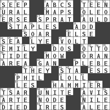 ACROSS 1. Ooze 5. Lettered men learn these first 9. Adolescent 13. Mountain range 14. Atlas contents 15. Butter sub 16. Celtic language 17. Small fatty European fish 18. Old (Scot.) 19. Paper fasteners 21. Find the sum of 22. Fly high 23. Otherwise 24. Ocean 27. Potassium hydroxide 28. Electrical Unit 29. Poet Dickinson 31. Two (Sp.) 32. Von Bismarck 36. Event that recurs at intervals 37. Cut the grass 38. Northwest Algerian city 39. Type of rug 40. Separate the seeds from cotton 41. Cadet 42. Those people 44. R.R. building 46. Curvy letter 47. Silvers or Donahue 48. Hang loosely or laxly 50. French article 51. More overdramatic by comparison 54. Russian ruler of old 56. Join together 58. Opinion 60. Johnson of "Laugh-In" 61. Connecting point 62. Mediterranean tributary 63. Passed on 64. Angers 65. Toward shelter DOWN 1. Take to court 2. Blunders 3. 90 degrees 4. Entreaties 5. Electrical Unit 6. Taverns 7. Tax preparer (abbr.) 8. Fast jet (abbr.) 9. Inedible or poisonous agaric 10. Dodge 11. Snakelike fish 12. Dreamland 17. Kill 20. Much (prefix) 21. 100% 23. Greek goddess of the dawn 24. Bristle 25. Independent ruler or chieftain 26. Assistant 28. Solemn pledge 30. Tough but pliablecoriaceous 31. Spanish title 33. Relationship diagram 34. Bar bills 35. Singles 37. Can I? 40. Set 41. Inside of hand 43. Part of HMS, perhaps 44. Chalkboards 45. Heavy book 47. Food holder 49. Woody, climbing, usually tropical plant 51. Flintstone garb 52. Tending to cause great harm 53. Cause heat under the collar 54. Small amount or degree 55. _ Lanka 56. Corn or form start 57. Not either 59. Perceive with the eye