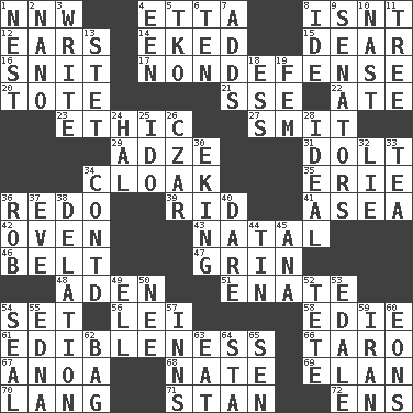 ACROSS 1. Compass dir. 4. Singer James 8. Is not 12. Hearing organs 14. Made supply last 15. Letter starter 16. In a ____ (agitated or irritated) 17. Unrelated to defense, as in spending 20. Lug 21. Compass dir. 22. Had dinner 23. Principle of right and wrong 27. Stricken, poetically 29. Edge tool used to cut and shape wood 31. Dunce 34. Anything that covers or conceals 35. 4th largest of the Great Lakes 36. Make new 39. To free from 41. At sea 42. Baking chamber 43. Relating to or accompanying birth 46. Waist strap 47. Amused look 48. An important port of Yemen 51. Related on the mother's side 54. Arrange properly for use 56. Flowery wreath 58. Singer Brickell 61. The property of being fit to eat 66. Edible starchy tuberous root 67. Small Philippine buffalo 68. Nathan's nickname 69. Style 70. Austrian-born American filmmaker Fritz 71. Comedian Laurel of Laurel & Hardy 72. Followers of ems DOWN 1. A home for chicks 2. Billionth: prefix 3. Compose 4. Car or cant ending 5. Ring climax 6. "___ Little Indians" 7. Sums up 8. Binary compound 9. Legislators 10. Political cartoonist Thomas 11. Woody plant 13. Proofreading order 18. Curvy letter 19. Opposite of masc. 24. Actor Linden 25. Wedding promise 26. Russian ruler of old 28. Perfect 30. Supplementing with great effort 32. Untruth 33. Beverage made from leaves 34. Continued (abbr.) 36. Director Reiner 37. First lady 38. Conveyance 40. Have the gumption 44. Metal container 45. Santa ___, CA 49. Pipe bend 50. Born 52. False hair 53. Peak District village in England 54. Lick closed 55. Pulitzer Prize-winning author Ferber 57. Taverns 59. SW Asia republic 60. Immeasurably long periods of time 62. Paper or plastic container 63. Consume 64. R.R. building 65. Elected rep.