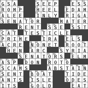 ACROSS 1. Girls' org. (abbr.) 4. Ooze 8. Double-curved letter 11. Frolic 13. The bottom of a shoe or boot 14. Dutch treat 15. Toward shelter 16. Inwardly 17. Port city in Latvia 18. Elected representative 21. Mother 22. Monthly bill 23. Compass dir. 25. Fast jet (abbr.) 26. Feline 29. One of the two male reproductive glands 32. First class 34. Retirement account (abbr.) 35. Raised railways 38. 1/640 square mile 39. Music written for nine 41. Carrot, for example 43. Layer 44. Curve 45. Damascus' land 46. Elected representatives 50. Shade tree 51. Cleo's killer 54. Spanish title 55. Printing process, for short 57. Fraudulent business schemes 59. Choose not to consume 63. Posted 64. Water vessel 67. Periodic rise and fall of the sea level 68. Pismires 69. Small island 70. Lyric poems 71. It is 72. Gilded 73. Erode DOWN 1. Pate de foie ____ 2. Flatfish 3. So be it 4. Chest coverings 5. Car or cant ending 6. Snakelike fish 7. Travel a route regularly 8. Prepares for publication 9. Gurus 10. Don Adams' spy role 12. Lightbulb-shaped fruit 14. Epoch 19. Wig 20. Single 21. Cartoonist voice _ Blanc 23. Title for a man of rank and authority 24. Scram! 26. Accounting whiz (abbr.) 27. Bowlike part 28. Hoop that covers a wheel 30. Tinged 31. Suggestive of the supernatural 33. Not women's 36. Old wives' tales, e.g. 37. Earth 39. Billionth: prefix 40. Northwest Algerian city 42. Scottish cap 45. Fast planes 47. Begley and Asner 48. Spoke pompously 49. Director Reiner 51. Slender Brazilian palm 52. Aroma 53. Leg coverings 56. "Beetle Bailey" pooch 58. Mountains (abbr.) 60. Assistant 61. The content of cognition 62. A home for chicks 64. Massive 65. Bear (Spanish) 66. Everything