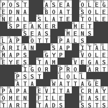ACROSS 1. Mail 5. Toward the sea 9. Cassini of fashion 13. Pulitzer Prize-winning author Ferber 14. Water vessel 15. Flatfish 16. Anneal 17. Chalkboard 18. Lacquered or enameled metalware 19. Orator 21. Was introduced to 22. Oceans 23. Not women's 24. Infant locale 27. Baseball player Mel 28. Friends 29. Believer in; advocate of (suffix) 31. Plant excrement 32. Slanted text style (abbr.) 36. Atlas contents 37. Hustle 38. Short-tailed, large-bodied rat 39. Sight organs 40. Scottish cap 41. Viva Las _ 42. Russian composer Stravinsky 44. Adept person 46. Tate display 47. Inconspicuous attention getter 48. Hang loosely or laxly 50. _ moment's notice (2 wds.) 51. Electrical Measurement 54. Dad 56. Webber/Rice musical 58. Supercomputer manufacturer 60. Presage 61. Do some clerical work 62. Relaxation 63. Small pie 64. Small amounts or degrees 65. Fast planes DOWN 1. Fenced enclosure 2. Lyric poems 3. Fastener 4. Lies 5. Most capable 6. Fly high 7. Consume 8. Had dinner 9. Clearly or manifestly demonstrative 10. Plunders 11. Pipe bend 12. Unit of force equal to gravity 17. Three-handed card game 20. A really long time 21. Cartoonist voice _ Blanc 23. Atlas unit 24. Unable to walk 25. Like ___ of sunshine 26. Corncob 28. Infant food 30. Helper 31. Symbol (abbr.) 33. Ancient Roman robe 34. Having or resembling wings 35. For fear that 37. Slender fish 40. Small child 41. Electrical Unit 43. Girls' org. (abbr.) 44. Food holders 45. Round or rotation of duties 47. Some stationery 49. Shoestrings 51. Uncontrolled 52. Pate de foie ____ 53. 90 degrees 54. Plant holder 55. Housemaid (var.) 56. Bank Draft (abbr.) 57. By way of 59. It is so