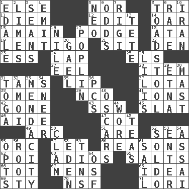 ACROSS 1. Otherwise 5. Not either 8. Three (prefix) 11. South Vietnam president (1954) 12. Prepare for publication 14. Rowing implement 15. At full speed 17. Porridge 18. _ moment's notice (2 wds.) 19. Small, flat, pigmented spot on the skin 21. Be seated 22. Lair 23. Double-curved letter 24. Infant locale 25. Raised railways 27. Snakelike fish 28. A distinct part 31. Scottish caps 35. Mouth edge 37. Globular water bottle used in Asia 38. Sign of something about to happen 39. Non-commissioned officer (abbr.) 41. Charged atoms 42. Went 43. Compass dir. 45. Narrow board 46. Helper 47. Small bed 49. Curve 51. "We ___ not amused" (Victoria) 52. Ocean 55. The grampus (Milton) 57. Allow 60. Thinks logically 62. Luau course 63. Goodbye (Sp.) 65. Table seasonings 66. Small child 67. Not women's 68. It may be bright or harebrained 69. Filthy place 70. Science/research agcy. 71. Australian parrot (variant) DOWN 1. Peak District village in England 2. Citrus fruits 3. Actors Connery and Penn 4. Send forth 5. Modern: prefix 6. Probability 7. Swiss mountan, "Queen of the Mountains" 8. Inedible or poisonous agaric 9. Assign a rank or rating to 10. SW Asia republic 13. False hair 16. "Death on the ____" 17. Cotton for raincoats, e.g. 20. Highlander 26. Ms. Damita and namesakes 29. Inactive volcano in Sicily 30. Vertical spar for supporting sails 31. Ancient Roman robe 32. Mine, in Marseilles 33. Ananias' fault 34. Scornful expression 36. Personal Computers (abbr.) 40. Motion picture awards 44. Had on 48. Beverages made from leaves 50. Burrowing marine mollusk 52. Twentieth part of a lira 53. Keyboard key 54. Slender Brazilian palm 55. Elects 56. Carrot, for example 58. Paradise 59. Airtight sealed metal containers 61. Travel by water 64. Order of Saint Francis (abbr.)
