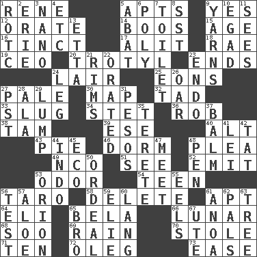 ACROSS 1. French philosopher Descartes 5. Flats, for short 9. It is so 12. Speak pompously 14. Scornful sounds 15. Grow older 16. A color or tint 17. Set down 18. Actress Charlotte 19. Corporate head (abbr.) 20. TNT 23. Conclusions 24. Den 25. Immeasurably long periods of time 27. Light colored 30. Atlas unit 32. Small amount or degree 33. Strike heavily 34. Proofreading order 36. Director Reiner 38. Scottish cap 39. Compass dir. 40. Keyboard modifier key 43. Sliced dessert 46. Dormintory (informal) 48. Entreaty 49. Non-commissioned officer (abbr.) 51. Perceive with the eye 52. Give off 53. Scent 54. Adolescent 56. Edible starchy tuberous root 58. Erase 61. Fitting 64. Biblical high priest 65. Actor Lugosi 66. Type of eclipse 68. "Barney Miller" actor Jack 69. Precipitation 70. Took without asking 71. "___ Little Indians" 72. Cassini of fashion 73. Relaxation DOWN 1. College mil. group 2. 4th largest of the Great Lakes 3. Billionth: prefix 4. And so on (abbr.) 5. Blind as ____ 6. More than one (prefix) 7. Rest room 8. Fast jet (abbr.) 9. Entertaining tales 10. Mild oath 11. Perceives with the eye 13. Singer James 21. Basketball hoops 22. Spoke pompously 23. Inside; within (prefix) 24. Part of a journey 26. Rowing implement 27. Pacific Standard Time (abbr.) 28. Chicken ___ king 29. Mass 31. Mexican monetary units 35. Cigar-shaped 37. Lip ointment 41. Luau accessory 42. Make lace 44. Southeast Asian peninsula 45. Environmental prefix 47. Confront 48. Writing instrument 50. Severe or trying experience 53. Constellation of myth 55. Snakelike fish 56. Trial 57. Medicinal plant 59. Writer Wiesel 60. Austrian-born American filmmaker Fritz 61. Small Philippine buffalo 62. Friends 63. Relationship diagram 65. Sis' sibling 67. Shoshoni
