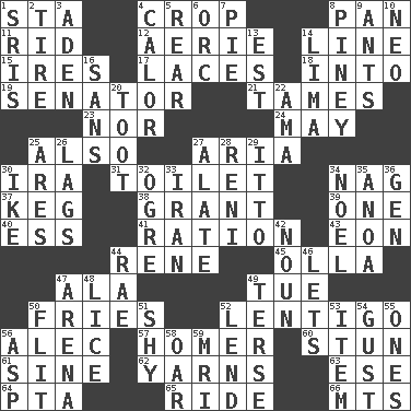 ACROSS 1. R.R. building 4. Riding implement 8. Baking dish 11. To free from 12. Nest on high 14. Actor's bit 15. Angers 17. Shoestrings 18. To the inside or interior of 19. Elected representative 21. Corrects by punishment or discipline 23. Not either 24. Fifth month 25. In addition 27. Operatic vocal solo 30. Retirement account (abbr.) 31. Bathroom plumbing fixture 34. Tired old horse 37. Barrel 38. Let have 39. Single 40. Double-curved letter 41. Food allowance for one day 43. Period of immesurable duration 44. French philosopher Descartes 45. Spanish pot 47. According to 49. Third day of the wk. 50. Strips of potato fried in deep fat 52. Small, flat, pigmented spot on the skin 56. Actor Baldwin 57. Home run 60. Make senseless or dizzy 61. Trig term 62. Tall tales 63. Compass dir. 64. Parent Teacher Association (abbr.) 65. Travel on or in a vehicle 66. Mountains (abbr.) DOWN 1. Indian titles of respect 2. Hoop that covers a wheel 3. Arabian gulf 4. Bodily heat indicating an inflammation 5. Located in or toward the back 6. The grampus (Milton) 7. Sliced dessert 8. Abounding in pines 9. Pismires 10. Modern: prefix 13. Eastern Standard Time (abbr.) 14. Pale green bean 16. Without 20. A blast of a horn 22. Nanny (var.) 25. Ancient Greek god of war 26. Fails to keep up a pace 27. Having winglike extensions 28. Painter Guido (1575-1642) 29. "Tell ____ the Marines!" 30. Mamie's mate 32. Legendary monster 33. SW Asia republic 34. Christmas carol 35. Small Philippine buffalo 36. Commissioned military rank (abbr.) 42. Part of speech 44. Actress Charlotte 46. Allows 47. Sports stadium 48. Louse (plural) 49. Laconic 50. Sudden quick movement 51. Like a shrinking violet 52. Grant temporary use of 53. A whole individual unit 54. Abrupt rush of wind 55. Washington bills 56. Viper 58. Rowing implement 59. Medical imaging device (abbr.)