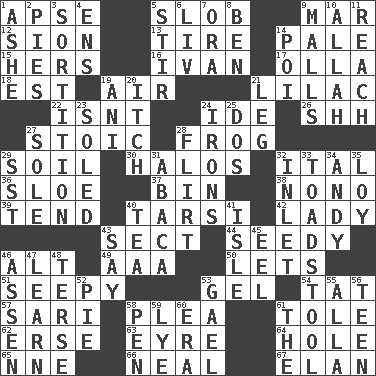 ACROSS 1. Domed church section 5. Oscar Madison type 9. Third mo. 12. The Jewish people; Israel 13. Become fatigued 14. Diluted with white 15. Possessive pronoun 16. _ the terrible 17. Spanish pot 18. Eastern Standard Time (abbr.) 19. Wind 21. Pale purple color 22. Is not 24. Binary compound 26. Quiet! 27. Unemotional 28. Tree-dwelling hopper 29. Earth 30. Rings 32. Slanted text style (abbr.) 36. A type of plum 37. Storage container 38. Words to Nanette 39. Look after 40. Tarsus (plural) 42. Kenny Rogers chart-topper in '80 43. Religious group 44. Full of seeds 46. Keyboard modifier key 49. American Automobile Association (abbr.) 50. Allows 51. Not well drained, as in land 53. Set 54. Make lace 57. Indian skirt 58. Entreaty 61. Lacquered or enameled metalware 62. Celtic language 63. Jane of fiction 64. Opening into or through something 65. Compass dir. 66. Be tempered by heat 67. Liveliness DOWN 1. American tennis player Robert 2. Sliced desserts 3. Making a chance decision by using lots 4. Followers of ems 5. Tumult 6. 54 in ancient Rome 7. Mouth or opening 8. Benjamin's nick name 9. Promenades 10. Assad's deity 11. Arrive at 14. Luau course 19. Cuckoo 20. Hankering 21. Part of a journey 23. Having a sole or soles 24. Removes the wrinkles 25. Two (Sp.) 27. Not divided or shared with others 28. Talk or behave amorously 29. Fast jet (abbr.) 31. Phillipine bananalike plant 32. An arm off of a larger body of water 33. Inedible or poisonous agaric 34. Actor Griffith 35. Myrna of the movies 40. Afternoon social gathering 41. Small island 43. Declare 45. Snakelike fish 46. NE Netherlands city 47. Acquire or gain knowledge or skills 48. Laconic 52. Sliced dessert 53. Highlander 55. Silent film actress Nazimova 56. Adolescent 58. Animal enclosure 59. Potassium hydroxide 60. Period 61. Definite Article
