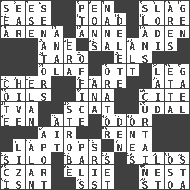 ACROSS 1. Perceives with the eye 5. Writing instrument 8. Volcanic refuse 12. Relaxation 13. Frog relative 15. Old wives' tales, e.g. 16. Sports stadium 18. Singer Murray 19. An important port of Yemen 20. One (Scot) 22. Deli grouping 24. Pacific island yam 26. Raised railways 27. Norwegian king 28. Baseball player Mel 29. Part of a journey 32. "Mermaids" star 35. Conductor's collection 37. _ moment's notice (2 wds.) 38. Petroleums 39. _ tizzy (2 wds.) 40. Quote 41. Federal power corp. 42. Get outta here! 43. Hereditary estate 44. Car or cant ending 45. Had dinner 46. Scent 49. Wind 50. Monthly bill 51. Portable computers 55. Teachers' org. 56. Grain storage tower 57. Soap units 59. Grain storage towers 63. Russian ruler of old 64. Writer Wiesel 65. A home for chicks 66. Is not 67. Fast jet (abbr.) 68. Portico DOWN 1. Ocean 2. Ewer handle 3. Compass dir. 4. Legislators 5. Parent Teacher Assoc. 6. Immeasurably long periods of time 7. Nanny 8. Criticizes harshly 9. Farming town in central California 10. Ancient Greek god of war 11. Commissioned military rank (abbr.) 14. Keyboard key 17. Of or related to the anus 21. Epoch 23. Keyboard modifier key 25. Place of business 28. Speaker 29. Put down 30. Singer James 31. Highlander 32. ____ d'Azur (French Riviera) 33. Hub of activity 34. Liveliness 36. Santa ___, CA 40. Window treatments 42. Disco prop 45. Small island 47. Lair 48. Singles 49. To the left, to Queeg 51. Belonging to Elizabeth 52. ____ Jay Lerner 53. Friends 54. Indian titles of respect 56. _-fi 58. Put into a specified state 60. Allow 61. Bear (Spanish) 62. R.R. building