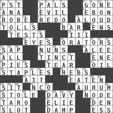 ACROSS 1. Pacific Standard Time (abbr.) 4. Friends 8. Went 12. Santa ___, CA 13. Morally bad or wrong 14. Inky black, to poets 15. Loose flowing garment 17. Redecorate 18. Verbally 19. For Whom the Bell _____ 21. Tavern 23. Followers of ems 24. Trials 26. One more than two 28. Snake ____ (dice throw) 30. Speakers 34. Plant excrement 37. Religious women 39. Toward shelter 40. 100% 41. A color or tint 43. Compass dir. 44. Sliced desserts 46. Pull apart 47. Petroleum 48. Paper fasteners 51. Confederate soldiers (slang) 54. Small island 55. Ingested 58. Be seated 61. Non-commissioned officer (abbr.) 63. Gold (Symbol: Au) 65. Took without asking 67. _ Jones' Locker 71. Thickened enlargement 72. Edible starchy tuberous root 73. Writer Wiesel 74. Lair 75. Slit 76. Moist 77. Curvy letter DOWN 1. Role in a play 2. Snob 3. Eating place 4. For each 5. "___ Maria" 6. Flaplike covering 7. Oscar Madison type 8. Set 9. Mitch Miller's instrument 10. Part of speech 11. Conclusions 16. Otherwise 18. Roberta Peters solo 20. Filthy place 22. Wind 25. Emitted 27. Call ___ day 29. Sets or collections 30. Witty Wilde 31. Butter sub 32. Painter Guido (1575-1642) 33. Stitch closed the eyes of (a falcon) 34. Plant excrements 35. Set down 36. Entreaty 38. Compass dir. 42. Woody plant 45. Health resort 49. Actor's bit 50. And so on (abbr.) 52. Sound made by sheep 53. Surprise greatly 56. Eat (away) 57. Unclothed pictures 58. Fast planes 59. Slanted text style (abbr.) 60. "Corrida" creature 62. Wrote a lyric poem 64. Not women's 66. Car dealer's back yard 68. According to 69. Zeal 70. Slangy assent
