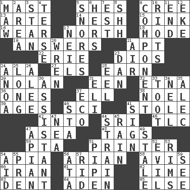 ACROSS 1. Vertical spar for supporting sails 5. "______ My Girl" (Turtles hit) 9. Algonquian 13. Johnson of "Laugh-In" 14. Soft 15. Pig sound 16. Erode 17. _ pole 18. Method 19. Responds (to) 21. Fitting 22. One of the Great Lakes 23. "Vaya con ____" 24. Insect wing 27. Raised railways 28. Merit 29. Pitcher Ryan 31. Car or cant ending 32. Inactive volcano in Sicily 36. Singles 37. Pipe bend 38. Christmas carol 39. Grows older 40. _-fi 41. Fur scarf 42. To the inside or interior of 44. Indian title of respect (Mr.) 46. Affectionate concern, for short 47. At sea 48. Labels 50. Parent Teacher Assoc. 51. Hard copy producer 54. Capital of Western Samoa 56. Believer in; advocate of (suffix) 58. Advice 60. SW Asia republic 61. Native american tent (variation) 62. Citrus frut 63. Gouge 64. Arabian gulf 65. Otherwise DOWN 1. Opening into something insatiable 2. Type of rug 3. Comedian Laurel of Laurel & Hardy 4. Laconic 5. Sounds asleep 6. Possessive pronoun 7. Eastern Standard Time (abbr.) 8. Quiet! 9. Part 10. Debaucheries 11. Conclusion 12. Supplement with great effort 17. Famous astronaut Armstrong 20. Songbird 21. Atmosphere 23. Daniel's nick name 24. Small Philippine buffalo 25. Protracted 26. Toward shelter 28. Snakelike fish 30. Aide 31. Connecticut Ivy Leaguer 33. A blast of a horn 34. 1994 drama film starring Jodie Foster 35. Actor Baldwin 37. Environmental prefix 40. R.R. building 41. Public display of a written message 43. Teachers' org. 44. Put through a sieve 45. Water falling in drops from the sky 47. Bee-related 49. Showing deterioration from age 51. Corncob 52. Tending to cause great harm 53. Basketball hoops 54. Help 55. Before (prefix) 56. _ moment's notice (2 wds.) 57. To free from 59. Perceive with the eye