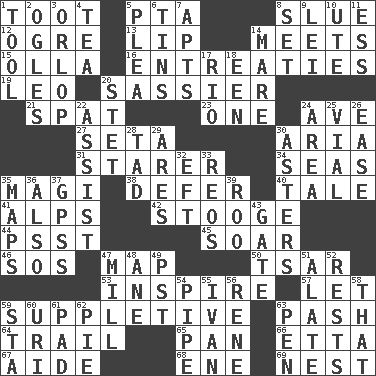 ACROSS 1. A blast of a horn 5. Parent Teacher Assoc. 8. Turn sharply 12. Legendary monster 13. Mouth edge 14. Confronts 15. Water jar 16. Pleas 19. Lion 20. More disrespectful 21. Petty quarrel 23. Single 24. "___ Maria" 27. Stalk of a moss capsule 30. Roberta Peters solo 31. A viewer who gazes fixedly 34. Oceans 35. Wise men 38. Put off 40. Story 41. High mountains 42. Moe Howard, for one 44. Inconspicuous attention getter 45. Fly high 46. Mayday 47. Atlas unit 50. Russian ruler of old 53. Motivate 57. Allow 59. Supplying deficiencies 63. Romantic infatuation 64. Hang back 65. Baking dish 66. Singer James 67. Assistant 68. Compass dir. 69. Egg locale DOWN 1. Utensil 2. Stares at amorously 3. Lowest deck of a ship 4. Beverage made from leaves 5. Entreaty 6. Canisters 7. Flats, for short 8. Arrange properly for use 9. Flowery wreath 10. Shoshoni 11. Double-curved letter 14. Female horse 17. River (Sp.) 18. Car or cant ending 20. Proofreading order 22. Help 24. Type of rug 25. Small bottle 26. Comfort 28. Small boy 29. Ancient Greek god of war 30. Michaelmas daisies 32. Newt 33. Vintage cars 35. Atlas contents 36. In addition 37. Global Positioning Systems (abbr.) 39. Friend of Pooh 43. Yard entry 47. Place where flour is made 48. A saturated hydrocarbon 49. Pacific Standard Time (abbr.) 51. Having winglike extensions 52. Musical pauses 54. Corncob 55. "Terrible" tsar 56. French philosopher Descartes 58. Not this but _ 59. R.R. building 60. RI univ. 61. Groovy apt. 62. Sliced dessert 63. Animal enclosure