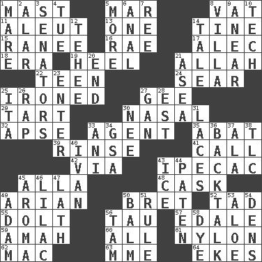 ACROSS 1. Vertical spar for supporting sails 5. Spoil 8. Large container 11. Eskimo relative 13. Single 14. Prong on a fork 15. The wife of a rajah (variant) 16. Actress Charlotte 17. Actor Baldwin 18. Epoch 19. Person who is morally reprehensible 21. Assad's deity 22. Adolescent 24. Wither 25. Pressed 27. Unit of force equal to gravity 29. Small pie 30. Relating to the nose 32. Domed church section 33. Rep 35. Blind as ____ 39. Remove soap 41. Give a ring to 42. By way of 43. Medicinal drug used to evoke vomiting 45. Silent film actress Nazimova 48. Keg 49. Believer in; advocate of (suffix) 50. Cy Young winner Saberhagen 52. Bit 55. Stupid person 56. The 19th letter of the Greek alphabet 57. Peak District village in England 59. Wet nurse 60. 100% 61. High-strength synthetic material 62. Apple computer (short form) 63. Madame (abbr.) 64. Supplements with great effort DOWN 1. Female horse 2. Having or resembling wings 3. Elected representatives 4. Third day of the wk. 5. Greater amount 6. Of or related to the anus 7. To sift 8. Country estate 9. Approach 10. Technician 12. Giggle 14. Story 20. Conclude 21. At sea 23. Keyboard key 25. Call ___ day 26. Reproach for some lapse or misdeed 27. Separate the seeds from cotton 28. Eastern Standard Time (abbr.) 30. Born 31. Shoestrings 33. Cuckoo 34. Girls' org. (abbr.) 36. Sass 37. Chicken ___ king 38. Affectionate concern, for short 40. "Terrible" tsar 43. Frozen water 44. Eucharist need 45. Scent 46. Pale purple color 47. Thin strip of wood or metal 49. First man 50. Lip ointment 51. Court order 53. _ vera 54. Habitations of wild animals 56. Scottish cap 58. Color