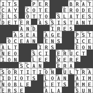 ACROSS 1. ___ a Wonderful Life 4. For each 7. Naughty child 11. Island 12. ____ d'Azur (French Riviera) 13. Wear away 14. Raised railways 15. Von Bismarck 16. Chalkboards 17. Prevent from occurring 19. Aide 21. Plus 23. Angers 24. At sea 25. Ripen 26. Pacific Standard Time (abbr.) 29. Sea 30. Followers of ems 31. Frozen water 32. The first octave above the treble staff 33. Big collection agency 34. A really long time 35. Modern: prefix 36. _-fi 37. Spew [out] 40. Electrically charged atom 41. Area sheltered from the wind 42. Past tense of be (plural) 43. Examine hastily 45. Epoch 46. Determination 51. Extreme 55. Foolish or stupid persons 56. Grant temporary use of 58. Direct toward a target or goal 59. Having high moral qualities 60. Allows 61. Madame (abbr.) 62. Celtic language 63. In the manner of 64. Player for Phoenix DOWN 1. On the rocks 2. Falsehood 3. System (abbr.) 4. Cooking vessel 5. Singer James 6. Vintage cars 7. Naughty children 8. Roll call or roster of names 9. An important port of Yemen 10. Trial 12. Pupil covering 13. Otherwise 16. Male parents of animals 18. Relaxation 20. Attaches a signature 22. Daniel's nick name 24. Gambison 25. Nest on high 26. Part 27. Highlander 28. Nine, plus one 29. Margarine 32. Black tropical American cuckoo 33. Ancient Celtic tribe of eastern Britain 36. Narrow boards 37. She-sheep 38. Summer TV shows 39. Mountain range 43. Fur scarf 44. Quote 46. Trig term 47. Scent 48. Teases 49. Rounded earthenware pot or jar 50. Christmas carol 52. Scottish caps 53. Tall New Zealand timber tree 54. So be it 57. "One Day ___ Time"
