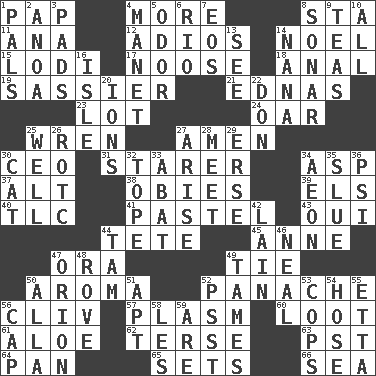 ACROSS 1. Infant food 4. Greater amount 8. R.R. building 11. Santa ___, CA 12. Goodbye (Sp.) 14. Christmas carol 15. Farming town in central California 17. Trap for birds or small mammals 18. Of or related to the anus 19. More lively and spirited 21. Ferber et al. 23. Car dealer's back yard 24. Boat paddle 25. Songbird 27. So be it 30. Corporate head (abbr.) 31. A viewer who gazes fixedly 34. Cleo's killer 37. Keyboard modifier key 38. Off-Broadway awards 39. Raised railways 40. Affectionate concern, for short 41. Soft color 43. Fr. "Yes" 44. False hair 45. Singer Murray 47. Mouth or opening 49. Standoff 50. Odor 52. Flamboyance 56. 154 in Roman numerals 57. Suffix with ecto or cyto 60. Plunder 61. _ vera 62. Laconic 63. Pacific Standard Time (abbr.) 64. Baking dish 65. Puts into a specified state 66. Ocean DOWN 1. Friends 2. Small Philippine buffalo 3. Writing tablets 4. French painter Edouard 5. Aroma 6. River (Sp.) 7. Greek goddess of the dawn 8. Echolocation 9. Beverages made from leaves 10. Everything 13. Observe 14. Grandmother 16. Small island 20. Charged particles 22. Spanish title 25. Not ill 26. College mil. group 27. Ascend 28. Confront 29. Celtic language 30. Domesticated feline 32. Drink excessively 33. Blind as ____ 34. Period of immesurable duration 35. Turn sharply 36. Air pressure measure (abbr.) 42. (Had) reclined 44. Scottish cap 46. Be tempered by heat 47. Greek mythologigal hunter 48. Be footloose 49. Softens 50. Silent film actress Nazimova 51. Fitting 52. Inconspicuous attention getter 53. 911 reaches them 54. Flexible conduit 55. Singer James 56. Head covering 58. French article 59. "We ___ not amused" (Victoria)