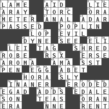 ACROSS 1. Unable to walk 5. Help 8. Falsehood 11. Like ___ of sunshine 12. Torque (variant) 14. Mouth or opening 15. Distance measurement 17. Of or related to the anus 18. The sixth month of the Jewish calendar 19. Went by 21. Cotton for raincoats, e.g. 23. Trim (branches) 25. Morally bad or wrong 26. Unit of force 27. Perceive with the eye 28. Connecticut Ivy Leaguer 31. Luau accessory 33. Label 35. Fragment 37. Loose flowing garment 38. Acura sports coupe 40. Celtic language 41. Scent 43. Nursemaid (var.) 45. Fast jet (abbr.) 46. Writing instrument 47. Oval reproductive body of a fowl 50. Collude with 52. Israeli folk dance 53. Mischievous 54. More lacking in sense or substance 56. Eaten away 61. Mild oath 62. Sums up 65. Peak District village in England 66. Male offspring 67. Beverages made from leaves 68. Northwest Algerian city 69. Period 70. Compass dir. 71. Monthly bill DOWN 1. Desk light 2. Length times width 3. Floor coverings 4. Sight organs 5. "One Day ___ Time" 6. Electrically charged atom 7. Window treatments 8. Farming town in central California 9. SW Asia republic 10. Hearing organ 13. Garlic unit 16. Trust 18. 100% 20. Do not 22. Sliced desserts 24. Lightbulb-shaped fruit 26. South Vietnam president (1954) 28. Blunders 29. For fear that 30. Binary compound 31. Old wives' tales, e.g. 32. Inky black, to poets 34. Girls' org. (abbr.) 36. Behest 37. Hit sharply and swiftly 39. Dec. holiday 42. Period of immesurable duration 44. Competent 48. Relatively large 49. Place where plants grow 51. Jane of fiction 52. Possessed 54. Composer Stravinsky 55. Nanny 57. Aroma 58. Have the gumption 59. Flair 60. Undesirable depression on a surface 61. Compass dir. 63. One of the 12 tribes of Israel 64. Compass dir.