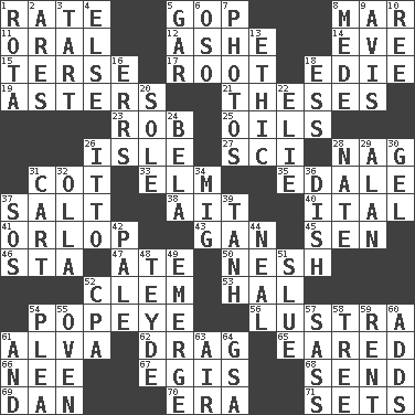 ACROSS 1. Assign a rank or rating to 5. Republican Party 8. Third mo. 11. Of the mouth 12. American tennis player Robert 14. Night before a holiday 15. Laconic 17. Carrot, for example 18. Singer Brickell 19. Michaelmas daisies 21. College papers 23. Director Reiner 25. Petroleums 26. Capri or Wight 27. _-fi 28. Tired old horse 31. Small bed 33. Shade tree 35. Peak District village in England 37. Table seasoning 38. Small island 40. Slanted text style (abbr.) 41. Fourth or lowest deck 43. Separate the seeds from cotton 45. Elected rep. 46. R.R. building 47. Had dinner 50. Tender 52. Clement's nick name 53. Actor Linden 54. Wimpy's pal 56. A period of five years 61. Inventor's middle name 62. To trail on the ground 65. Having ears or earlike features 66. Born 67. Armor plate that protects the chest 68. Transmit 69. One of the 12 tribes of Israel 70. Period 71. Puts into a specified state DOWN 1. Round or rotation of duties 2. Ancient Greek god of war 3. Small pie 4. Otherwise 5. Slender fish 6. Bear (Spanish) 7. Pictures 8. Ancient Persian 9. Deliberation 10. To separate or throw off 13. Principle of right and wrong 16. Blunders 18. Double-curved letter 20. Not divided or shared with others 22. Writer Wiesel 24. Actor Lugosi 26. "Tell ____ the Marines!" 28. Nathan's nickname 29. Actor Alda or Thicke 30. Set 31. Draw slowly or heavily 32. Water jar 34. Russian fighter aircraft 36. Food container 37. Distress signal 39. Hyperbolic tangent 42. Diluted with white 44. Anneal 48. Miss Universe 1986, Barbara Palacios _ 49. Develop 51. Turn sharply 52. Accounting whiz (abbr.) 54. Entreaty 55. Baking chamber 57. Backtalk 58. Relationship diagram 59. Monthly bill 60. Sums up 61. Plus 63. Atmosphere 64. Girls' org. (abbr.)