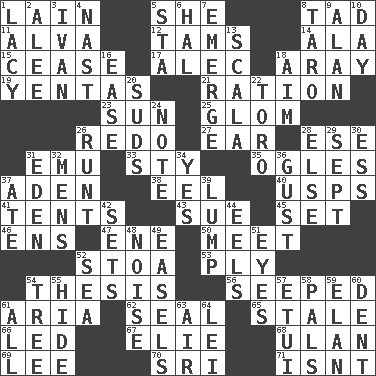 ACROSS 1. (Had) reclined 5. A female animal or person 8. Small amount or degree 11. Inventor's middle name 12. Scottish caps 14. Wing 15. Stop 17. Actor Baldwin 18. Like ___ of sunshine 19. Gossips 21. Food allowance for one day 23. Player for Phoenix 25. Take by theft 26. Do over again 27. Ewer handle 28. Compass dir. 31. Australian flightless bird 33. Filthy place 35. Stares at amorously 37. Arabian gulf 38. Snakelike fish 40. United States Postal Service (abbr.) 41. Portable shelters 43. Institute legal proceedings 45. Put into a specified state 46. Followers of ems 47. Compass dir. 50. Rendezvous 52. Portico 53. Strand of rope, yarn or thread 54. College paper 56. Oozed 61. Operatic vocal solo 62. Lick closed 65. Having lost freshness 66. Directed 67. Writer Wiesel 68. ____ Bator, Mongolia 69. Area sheltered from the wind 70. Indian title of respect (Mr.) 71. Is not DOWN 1. Made of lace 2. Toward shelter 3. "Terrible" tsar 4. Political cartoonist Thomas 5. R.R. building 6. Actor Linden 7. Develop 8. Edible starchy tuberous root 9. ____ Jay Lerner 10. 24 hours 13. Any of the three canals of the cochlea 16. Relaxation 18. Direct toward a target or goal 20. Soap bubbles 22. "Corrida" creature 24. Short letter 26. Undersized animal 28. Otherwise 29. Back-to-school mo. 30. Curvy letter 31. Genesis locale 32. Not women's 34. It is so 36. Abrupt rush of wind 37. Had dinner 39. Mass 42. Puts into a specified state 44. Snakelike fish 48. Annoying sound 49. Artist's stands 51. Snake ____ (dice throw) 52. Ocean 54. Woody plant 55. Flintstone garb 57. Needle holder 58. Friends 59. Liveliness 60. Undesirable depression on a surface 61. 100% 63. Wind 64. Luau accessory
