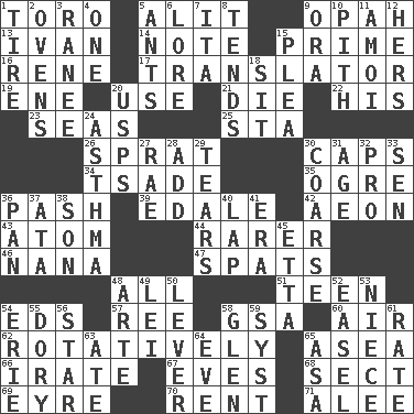 ACROSS 1. "Corrida" creature 5. Came down and settled, as after flight 9. Brightly colored fish 13. "Terrible" tsar 14. Observe 15. First class 16. French philosopher Descartes 17. Interpreter 19. Compass dir. 20. Purpose 21. Expire 22. Part of HMS, perhaps 23. Oceans 25. R.R. building 26. Small fatty European fish 30. Smile enhancers 34. Sadhe (variant) 35. Legendary monster 36. Romantic infatuation 39. Peak District village in England 42. A really long time 43. Smallest unit of an element 44. Less widely known 46. Grandmother 47. Arguments over trivial matters 48. Everything 51. Adolescent 54. Begley and Asner 57. To riddle 58. Girls' org. (abbr.) 60. Atmosphere 62. Producing rotation 65. Toward the sea 66. Feeling or showing extreme anger 67. Nights before holidays 68. Religious group 69. Jane of fiction 70. Monthly bill 71. Toward shelter DOWN 1. Hoop that covers a wheel 2. Baking chambers 3. The wife of a rajah (variant) 4. Single 5. Pismires 6. Old wives' tales, e.g. 7. Call ___ day 8. Looks after 9. Mouth or opening 10. Essential or central part 11. Mine, in Marseilles 12. Possessive pronoun 15. Entreaty 18. Be seated 20. United States Postal Service (abbr.) 24. Respiratory problem 27. Actress Charlotte 28. Find the sum of 29. Lacerates 30. Rough 31. Ripen 32. Adept person 33. Elected rep. 36. Baking dish 37. _ moment's notice (2 wds.) 38. Male child 40. Pet locale 41. Epoch 45. Singer James 48. Johnson of "Laugh-In" 49. Flowery wreath 50. Crowbar 52. Artist's stand 53. Sibling's daughter 54. One of the Great Lakes 55. Rowboat 56. Play the lead 58. Small, secluded valley 59. System (abbr.) 61. Assign a rank or rating to 63. Had dinner 64. Night before a holiday 65. White ___ sheet