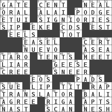ACROSS 1. Yard entry 5. Penny 9. Be tempered by heat 13. Relating to the mouth 14. Jai ____ 15. Plash 16. Needle case 17. Seigniories (variant) 19. Small drink 20. Supplement with great effort 21. Music discs 22. Eastern Standard Time (abbr.) 23. Snakelike fish 25. Small child 26. Artist's stand 30. Sure thing 34. New (sp.) 35. Toward the sea 36. Pacific island yam 39. Portable shelters 42. Confront 43. One who doesn't tell the truth 44. Honkers 46. Algonquian 47. Contemptuous expression 48. Greek goddess of the dawn 51. Groovy apts. 54. Institute legal proceedings 57. Mouth edge 58. Teat (slang) 60. Reproach for some lapse or misdeed 62. Interpreter 65. Indonesian resort city 66. Match 67. Port city in Latvia 68. Tenement units (abbr.) 69. Political cartoonist Thomas 70. Glance over 71. Delicate DOWN 1. Leaves 2. Nick name for Arthur 3. Grayish beige 4. Connecticut Ivy Leaguer 5. Keg 6. Writer Wiesel 7. Tired old horse 8. Tinged 9. Not either 10. Singer Brickell 11. Eons 12. For fear that 15. Mail 18. Wedding promise 20. Son of Isaac 24. Poe poem 27. Put into a specified state 28. Night before a holiday 29. Yearns 30. Device for capturing images 31. Compass dir. 32. To separate or throw off 33. Make lace 36. Affectionate concern, for short 37. Wind 38. Actress Charlotte 40. Nine, plus one 41. Observe 45. Back-to-school mo. 48. Otherwise 49. Lubricate 50. Practice fights 52. Window treatment 53. Table seasonings 54. Comedian Laurel of Laurel & Hardy 55. Capital and largest city of Mongolia 56. Hearing organs 58. Ancient Roman robe 59. SW Asia republic 61. Expression of disdain 63. Fish or hair follower 64. Nervous spasm 65. Forbid