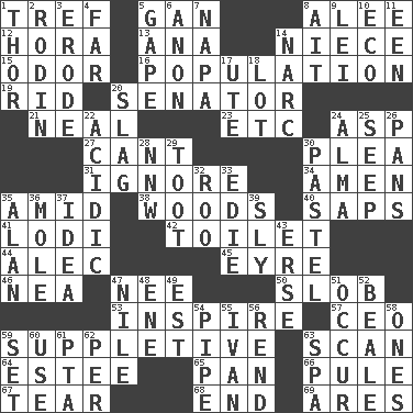 ACROSS 1. Not kosher 5. Separate the seeds from cotton 8. Toward shelter 12. Israeli folk dance 13. Santa ___, CA 14. Sibling's daughter 15. Scent 16. Census information 19. To free from 20. Legislator 21. Actress Patricia 23. And so on (abbr.) 24. Cleo's killer 27. Patter 30. Entreaty 31. Dismiss 34. So be it 35. Among 38. Forest 40. Plant excrements 41. Farming town in central California 42. Bathroom plumbing fixture 44. Actor Baldwin 45. Jane of fiction 46. Teachers' org. 47. Born 50. Messy guy 53. Motivate 57. Corporate head (abbr.) 59. Supplementary 63. Examine hastily 64. First name in cosmetics 65. Baking dish 66. Whimper 67. Separate forcefully 68. Conclusion 69. Ancient Greek god of war DOWN 1. Son of Odin 2. "The Thinker" sculptor 3. Wear away 4. At a great distance 5. Open wide 6. At once, immediately (arch.) 7. California wine valley 8. Small island 9. Luau accessory 10. Environmental prefix 11. Car or cant ending 14. Drug cop 17. Shoshoni 18. Car dealer's back yard 20. Volcanic refuse 22. Being or containing an acid 24. _ mater 25. Ooze 26. Zero-star reviews 28. Compass dir. 29. A blast of a horn 30. Soft color 32. Friend of Pooh 33. Singer Brickell 35. ____ Jay Lerner 36. Undercover agent 37. The main thing one is thinking about 39. Insidious 43. Celtic language 47. Mediterranean tributary 48. Compass dir. 49. Eastern Standard Time (abbr.) 51. Happen 52. Calif. Air Force Base 54. Corncob 55. "Terrible" tsar 56. Tear apart 58. Washington bills 59. Put into a specified state 60. Purpose 61. Parent Teacher Assoc. 62. For each 63. Health resort