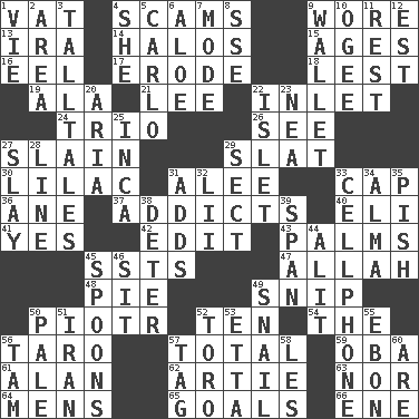 ACROSS 1. Large container 4. Fraudulent business schemes 9. Had on 13. Lyricist Gershwin 14. Radiant circles of light 15. Matures 16. Snakelike fish 17. Wear away 18. For fear that 19. Insect wing 21. Area sheltered from the wind 22. An arm off of a larger body of water 24. Musical group of three 26. Observe 27. Killed 29. Narrow board 30. Pale purple color 31. Toward shelter 33. Head covering 36. A saturated hydrocarbon 37. Inveterate users 40. Biblical high priest 41. It is so 42. Prepare for publication 43. Insides of hands 45. Fast planes 47. Assad's deity 48. Sliced dessert 49. Sever or remove by pinching or nipping 50. Peter (Polish) 52. "___ Little Indians" 54. Definite Article 56. Pacific island yam 57. "_____ Recall" 59. Chief or king in Benin or Nigeria 61. ____ Jay Lerner 62. Nick name for Arthur 63. Not either 64. Not women's 65. Finish lines 66. Compass dir. DOWN 1. Compete 2. Type of rug 3. Baron Munchausen's specialties 4. A female animal or person 5. Monte _, Las Vegas Hotel/Casino 6. _ vera 7. Method 8. Compass dir. 9. Place for singles 10. Double curve, resembling the letter S 11. State of inaction 12. Eastern Standard Time (abbr.) 20. Roberta Peters solo 22. Small island 23. Teachers' org. 25. South American Indian 27. Kill 28. Actor's bit 29. Religious group 31. Sums up 32. Cards in a Roman deck? 33. Portable communications device 34. _ mater 35. Expression of disdain 38. Prevent from occurring 39. Connect, as a bridge 44. Set down 45. Soup utensils 46. Be seated 49. Slow-paced one 50. Light colored 51. SW Asia republic 52. "Corrida" creature 53. Singer James 55. Inky black, to poets 56. Scottish cap 57. Label 58. French article 60. "We ___ not amused" (Victoria)