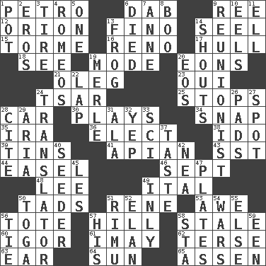 ACROSS 1. Stone: prefix 6. Apply (a substance) by light strokes 9. Portuguese money of account (variant) 12. Constellation of myth 13. Fine (Spanish) 14. Stitch closed the eyes of (a falcon) 15. Singer Mel 16. Former U.S. Attorney General Janet 17. Frame or body of a ship 18. Perceive with the eye 19. Method 20. Immeasurably long periods of time 21. Cassini of fashion 23. Fr. "Yes" 24. Russian ruler of old 25. Discontinues 28. Auto 30. Live dramatic performances 34. Fastener 35. Lyricist Gershwin 36. Opt 38. Wedding promise 39. Canisters 41. Bee-related 43. Fast jet (abbr.) 44. Artist's stand 46. Back-to-school mo. 48. Area sheltered from the wind 49. Slanted text style (abbr.) 50. Small boys 51. French philosopher Descartes 53. Deep reverence 56. Haul 57. Land elevation 58. Lacking originality or spontaneity 60. Composer Stravinsky 61. "If ____ say so..." 62. Laconic 63. Hearing organ 64. Player for Phoenix 65. NE Netherlands city DOWN 1. Plant holder 2. Greek god of love 3. Hoop that covers a wheel 4. Lover boys 5. Single 6. Passed on 7. Queen of England 1702-14 8. Surprise greeting 9. One who advocates reunion 10. Snakelike fish 11. Pipe bend 13. Toadlike animal 14. Yells 19. Haggard of country music 20. Greek goddess of the dawn 22. Infant locale 24. Interpreter 26. Groovy apts. 27. Specific locale 28. Quote 29. Operatic vocal solo 31. Insect wing 32. Slangy assent 33. _-fi 37. Clothes sense 40. Sowing specialist 42. Teachers' org. 45. French article 47. Food holders 49. Inwardly 50. Ancient Roman robe 51. Tall New Zealand timber tree 52. Flair 54. Armed conflicts 55. Otherwise 56. Neckwear 57. Part of HMS, perhaps 58. R.R. building 59. Car or cant ending