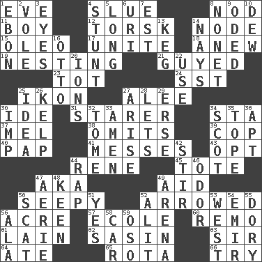 ACROSS 1. Night before a holiday 4. Turn sharply 8. Dreamland 11. Male child 12. Cod relative 14. Connecting point 15. Margarine 17. Join together 18. Afresh 19. Snuggling 21. Ridiculed 23. Small child 24. Fast jet (abbr.) 25. Visual representation of an object 27. Toward shelter 30. Binary compound 31. A viewer who gazes fixedly 34. R.R. building 37. Cartoonist voice _ Blanc 38. Leaves out 39. Police officer (slang) 40. Infant food 41. Makes clutter 43. Choose 44. French philosopher Descartes 45. Carry 47. Alias (abbr.) 49. Help 50. Oozy 52. Moved like an arrow 56. 43,560 square feet 57. Learning spot: Fr. 60. San ____ (Riviera town) 61. (Had) reclined 62. Indian antelope 63. Title for a knight 64. Had dinner 65. Roll call or roster of names 66. Attempt to accomplish something DOWN 1. Inky black, to poets 2. Grand slam 3. Snake ____ (dice throw) 4. Check the growth or development of 5. Yearn 6. RI univ. 7. Eastern Standard Time (abbr.) 8. Music written for nine 9. Wrote a lyric poem 10. Morning condensation 13. Barrel 14. Negative votes 16. "Beetle Bailey" pooch 20. Charged atoms 22. Purpose 25. It may be bright or harebrained 26. Seaweed 27. Originate 28. Allows 29. Celtic language 30. Naughty child 32. Heavy book 33. So be it 34. Native of Scotland 35. Drink excessively 36. Fitting 42. Agitate 44. Reproach for some lapse or misdeed 46. Scent 47. Nest on high 48. Peachy ____! 49. Sports stadium 50. Scram, to a cat 51. Consenting reply 52. Set down 53. 270 degrees 54. Arab leader 55. Dinghy 56. In the manner of 58. 4-wheeled motor vehicle 59. Bear (Spanish)