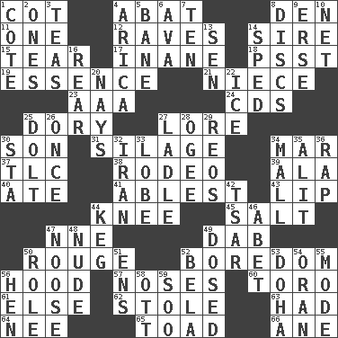 ACROSS 1. Small bed 4. Blind as ____ 8. Lair 11. Single 12. All-night dance parties 14. The founder of a family 15. Lacerate 17. Empty; void 18. Inconspicuous attention getter 19. Gist 21. Sibling's daughter 23. American Automobile Association (abbr.) 24. Music discs 25. Dinghy 27. Old wives' tales, e.g. 30. Male offspring 31. Fodder prepared in a silo 34. Third mo. 37. Affectionate concern, for short 38. Cowboy competition 39. According to 40. Had dinner 41. Most capable 43. Mouth edge 44. Leg joint 45. Table seasoning 47. Compass dir. 49. Small moist lump or mass 50. Makeup applied to the cheeks 52. Mood resulting from idleness 56. Parka part 57. Olfactory organs 60. "Corrida" creature 61. Otherwise 62. Took without asking 63. Possessed 64. Born 65. Frog relative 66. A saturated hydrocarbon DOWN 1. ____ d'Azur (French Riviera) 2. Singles 3. Beverages made from leaves 4. N. Chile seaport 5. Object of repulsion 6. Actress Gardner 7. "___ Little Indians" 8. Plates 9. Celtic language 10. Remaining after all deductions 13. Elected rep. 14. Broke a traffic law 16. Hitchcock's "____ Window" 20. Negative votes 22. Frozen water 25. Stupid person 26. At one time in the past 27. Dipping utensil 28. Double curve, resembling the letter S 29. Vintage cars 30. R.R. building 32. SW Asia republic 33. Ear part 34. Promenade 35. Set down 36. Reproach for some lapse or misdeed 42. Russian ruler of old 44. Cask 46. Collude with 47. Trap for birds or small mammals 48. Naked 49. Administered medicine 50. Hero or heavy, e.g. 51. Followers of ems 52. Actor Lugosi 53. Capital of the state of Qatar 54. Northwest Algerian city 55. Method 56. Layer 58. Baseball player Mel 59. "Barney Miller" actor Jack