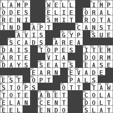 ACROSS 1. Desk light 5. Water source 9. Naughty child 12. Lyric poems 13. Writer Wiesel 14. Spoken 15. Painter Guido (1575-1642) 16. Stricken, poetically 17. Round or rotation of duties 18. Indiana (abbr.) 19. Fitting 21. 2nd pers. sing. pres. of can (arch.) 22. Deliberation 24. Flimflam 26. Take to court 27. Heaps 28. Type of rug 29. Raised platform 30. Drinks excessively 32. A distinct part 36. Johnson of "Laugh-In" 37. By way of 38. Dormintory (informal) 39. 24-hour periods 40. Theater features 42. Comfort 43. Merit 44. Elude 46. Eastern Standard Time (abbr.) 49. Choose 50. Friends 51. Obstructs or blocks passage 53. Baseball player Mel 54. The 23rd letter of the Hebrew alphabet 57. Carry 58. Collude with 61. Root beer relative 62. Enthusiasm 63. Penny 64. Dunce 65. Snakelike fish 66. Inside; within (prefix) 67. Narrow board DOWN 1. Australian parrot (variant) 2. An important port of Yemen 3. Ananias' fault 4. 23rd letter of the Greek alphabet 5. Compass direction 6. Shade tree 7. Cards in a Roman deck? 8. Allow 9. Metal shackles 10. Taiwanese island in East China Sea 11. Food holder 14. Mouth or opening 19. Assist 20. Inconspicuous attention getter 21. Numbers guy (abbr.) 23. Flower holders 24. Relatively large 25. Consenting reply 27. "Two Mules for Sister ____" 28. Bee-related 29. Male parent 31. Unconcealed 32. Standard of perfection 33. Inedible or poisonous agaric 34. Celtic language 35. Madame (abbr.) 40. Plant excrement 41. Back-to-school mo. 43. Greek goddess of the dawn 45. Large container 46. First name in cosmetics 47. Took without asking 48. "_____ Recall" 52. Fenced enclosure 53. "Beetle Bailey" pooch 55. Silent film actress Nazimova 56. Electrical Unit 58. Adept person 59. Benjamin's nick name 60. Conclude 61. Music discs