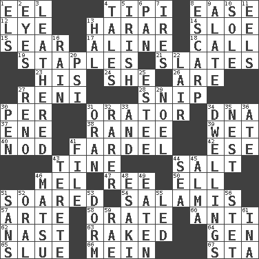 ACROSS 1. Snakelike fish 4. Native american tent (variation) 8. Relaxation 12. Sodium hydroxide 13. Ethiopian city, capital of Harari 14. _ gin 15. Scorch 17. Place in a line 18. Give a ring to 19. Paper fasteners 21. Chalkboards 23. Part of HMS, perhaps 24. A female animal or person 26. "We ___ not amused" (Victoria) 27. Painter Guido (1575-1642) 28. Clip 30. For each 31. Speaker 34. Heredity factor (abbr.) 37. Compass dir. 38. The wife of a rajah (variant) 39. Dripping 40. Allow head to fall sleepily 41. Pack 42. Compass dir. 43. Prong on a fork 44. Table seasoning 46. Cartoonist voice _ Blanc 47. To separate or throw off 50. Pipe bend 51. Flew 54. Deli grouping 57. Johnson of "Laugh-In" 58. Speak pompously 60. Opposed to 62. Political cartoonist Thomas 63. Swept the length of 64. Commissioned mil. rank 65. Change direction abruptly 66. Count _ (2 wds.) 67. R.R. building DOWN 1. Raised railways 2. Sight organs 3. Resembling or made to resemble leather 4. Lies 5. From or relating to Ireland 6. Baking dish 7. Angers 8. Fortification 9. Having winglike extensions 10. Not divided or shared with others 11. Snakelike fish 13. Actor Linden 16. Precipitation 20. Air pressure measure (abbr.) 22. Den 25. First name in cosmetics 27. Former U.S. Attorney General Janet 29. Christmas carol 30. Fenced enclosure 31. NW Algerian seaport 32. More uncommon 33. Added to 34. Homes 35. A home for chicks 36. Had dinner 41. Do some clerical work 43. Cylindrical with tapered ends 44. Ocean 45. _ mater 46. Taiwanese island in East China Sea 48. 1973 Nobel Price Winner (Physics) Leo 49. Consumed 51. Without 52. Taken by mouth 53. Dormintory (informal) 55. Directed 56. Proofreading order 59. Actress Charlotte 61. _ tizzy (2 wds.)