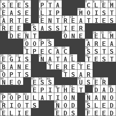 ACROSS 1. Perceives with the eye 5. Parent Teacher Assoc. 8. Clement's nick name 12. Comfort 13. Mouth edge 14. Wet 15. Johnson of "Laugh-In" 16. Pleas 19. To riddle 20. More impudent 21. Undesirable depression on a surface 23. Single 24. Shade tree 27. I made a mistake 30. Length times width 31. Medicinal drug used to evoke vomiting 34. Fast planes 35. The front part of a cuirass 38. Relating to or accompanying birth 40. Trial 41. Object of repulsion 42. Cylindrical with tapered ends 44. Elects 45. Russian ruler of old 46. Modern: prefix 47. Curvy letter 50. One who makes use of a thing 53. Curse 57. June honoree 59. Census information 63. Billionth: prefix 64. Debaucheries 65. Dreamland 66. Downhill vehicle 67. Writer Wiesel 68. Begley and Asner 69. Nourish DOWN 1. Burn superficially 2. Having ears or earlike features 3. First name in cosmetics 4. Observe 5. Entreaty 6. Canisters 7. Flats, for short 8. Small bed 9. Cards in a Roman deck? 10. Compass dir. 11. Mountains (abbr.) 14. Female horse 17. River (Sp.) 18. Car or cant ending 20. Halt 22. Annoying sounds 24. Celtic language 25. Allows 26. Vertical spar for supporting sails 28. Writing instrument 29. Get outta here! 30. Michaelmas daisies 32. Had dinner 33. Draw slowly or heavily 35. Inky black, to poets 36. Yawn 37. To the inside or interior of 39. French article 43. Drawn tight 47. Snakelike fish 48. Health resort 49. Be seated 51. Peak District village in England 52. The wife of a rajah (variant) 54. Prong on a fork 55. Parka part 56. Extremities 58. Texas town _ City 59. Before (prefix) 60. Lubricate 61. Luau course 62. Shoshoni 63. Science/research agcy.