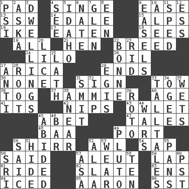 ACROSS 1. Groovy apt. 4. Scorch 9. Relaxation 13. Compass dir. 14. Peak District village in England 15. High mountains 16. Eisenhower's nickname 17. Consumed 18. Perceives with the eye 19. Everything 21. Layer 22. A special lineage 24. _ and Stitch 26. Lubricate 27. N. Chile seaport 29. Extremities 30. Music written for nine 31. Signal 33. Pull behind 36. Coat; cloak 37. More given to overacting 40. Personal question 41. ___ a Wonderful Life 42. Cuts off 43. A small or young owl 45. Collude with 47. Falsehoods 48. Sound made by sheep 49. Sweet dark-red dessert wine 50. Bake eggs in their shells 52. Leather borer 54. Plant excrement 56. Stated 57. Eskimo relative 59. Pet locale 61. Travel on or in a vehicle 62. Schedule 63. Followers of ems 64. On the rocks 65. Composer Copland 66. Fast jet (abbr.) DOWN 1. 23rd letter of the Greek alphabet 2. "____ silly question..." 3. Residences 4. Observe 5. Potato state 6. Nathan's nickname 7. Small, secluded valley 8. Car or cant ending 9. Artist's stands 10. Toward shelter 11. Hurried 12. Curvy letter 20. Louse (plural) 22. Child's nurse 23. To free from 25. Thin strip of wood or metal 27. Opposed to 28. Carrot, for example 29. The front part of a cuirass 31. Stricken, poetically 32. Naughty child 33. Baron Munchausen's specialties 34. Double curve, resembling the letter S 35. Soaks 38. Approach 39. Printing process, for short 44. Armed conflicts 45. Stayed 46. Soap unit 49. Cartoon dog 50. Ketch in the Levant 51. Flintstone garb 52. Silent film actress Nazimova 53. Put on (as clothing) 55. Zero-star reviews 56. _ Lanka 57. White ___ sheet 58. Nine, plus one 60. Pacific Standard Time (abbr.)