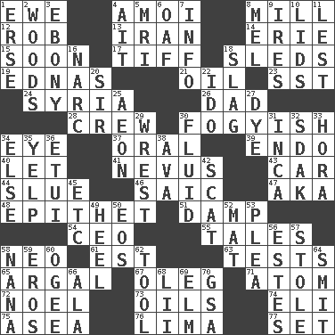 ACROSS 1. She-sheep 4. Mine, in Marseilles 8. Place where flour is made 12. Director Reiner 13. SW Asia republic 14. One of the Great Lakes 15. Within a short period 17. Small quarrel 18. Bobsleighs 19. Ferber et al. 21. Lubricate 23. Fast jet (abbr.) 24. Damascus' land 26. June honoree 28. Ship's personnel 30. Out of fashion; old fashioned 34. Sight organ 37. Relating to the mouth 39. Inside; within (prefix) 40. Allow 41. Congenital growth or mark on the skin 43. Auto 44. Change direction abruptly 46. Ketch in the Levant 47. Alias (abbr.) 48. Curse 51. Moist 54. Corporate head (abbr.) 55. Lies 58. Modern: prefix 61. Eastern Standard Time (abbr.) 63. Trials 65. Therefore, facetiously 67. Cassini of fashion 71. Tiny particle 72. Christmas carol 73. Petroleums 74. Connecticut Ivy Leaguer 75. Toward the sea 76. Pale green bean 77. Arrange properly for use DOWN 1. Celtic language 2. Forest 3. Dark wood 4. Small island 5. Medical imaging device (abbr.) 6. Clumsy lout 7. A message received and understood 8. Cartoonist voice _ Blanc 9. Angers 10. Hats (slang) 11. For fear that 16. Drug cop 18. Volcanic refuse 20. Title for a knight 22. Wedding promise 25. A really long time 27. Color 29. Obtain by seizing forcibly or violently 30. Watery 31. South American Indian 32. Neighbor of Neb. 33. Israeli folk dance 34. Otherwise 35. Sharp bark 36. Needle case 38. Actress Gardner 42. Get outta here! 45. And so on (abbr.) 49. Person who is morally reprehensible 50. Greek goddess of the dawn 52. Floor protector 53. Entreaty 56. _____ Park, CO 57. Fur scarf 58. Nanny 59. Greek god of love 60. Double curve, resembling the letter S 62. Instrument 64. Stricken, poetically 66. According to 68. Cards in a Roman deck? 69. Shade tree 70. Girls' org. (abbr.)