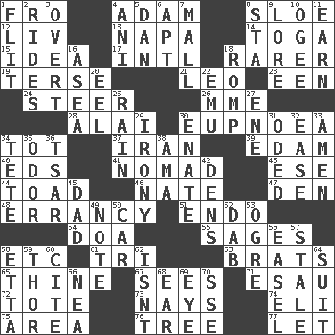 ACROSS 1. Away 4. First of billions? 8. _ gin 12. 54 in ancient Rome 13. California wine valley 14. Ancient Roman robe 15. The main thing one is thinking about 17. International (abbr.) 18. More valued for its uncommonness 19. Laconic 21. Lion 23. Car or cant ending 24. Navigate 26. Madame (abbr.) 28. Jai _ 30. Normal relaxed breathing 34. Small child 37. SW Asia republic 39. Dutch treat 40. Begley and Asner 41. Wanderer 43. Compass dir. 44. Frog relative 46. Nathan's nickname 47. Lair 48. Tendancy to err 51. Inside; within (prefix) 54. ___ good deed 55. Gurus 58. And so on (abbr.) 61. Three (prefix) 63. Naughty children 65. One or ones belonging to thee 67. Perceives with the eye 71. Son of Isaac 72. Carryall 73. Negative votes 74. Biblical high priest 75. Length times width 76. Relationship diagram 77. Allow DOWN 1. Secret move to avoid paying debts 2. Amusement-park features 3. Unconcealed 4. Cuckoo 5. One of the 12 tribes of Israel 6. Fitting 7. Promenade 8. R.R. building 9. Old wives' tales, e.g. 10. Double curve, resembling the letter S 11. Merit 16. Toward the sea 18. Play 20. Snakelike fish 22. Australian flightless bird 25. Water falling in drops from the sky 27. Compass dir. 29. Literary sarcasm 30. Maternal 31. Wrote a lyric poem 32. Comfort 33. So be it 34. Wig 35. Scent 36. Russian ruler of old 38. Housemaid (var.) 42. Lairs 45. Male parent 49. Make mention of 50. 4-wheeled motor vehicle 52. Apply (a substance) by light strokes 53. Legendary monster 56. Artist's stand 57. Having lost freshness 58. Singer James 59. Son of Odin 60. Quote 62. Is not 64. Set or collection 66. Teachers' org. 68. Ewer handle 69. Sight organ 70. Compass dir.