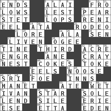 ACROSS 1. Conclusions 5. Jai _ 9. Away 12. Coldest temperatures 13. For fear that 14. Lightbulb-shaped fruit 15. Proofreading order 16. Chops off 17. Painter Guido (1575-1642) 18. Snakelike fish 19. _ moment's notice (2 wds.) 21. Cowboy competition 22. Old wives' tales, e.g. 24. In the manner of 26. Elected rep. 27. Make or become more lively 28. Double curve, resembling the letter S 29. Prong on a fork 30. One of three equal parts 32. Measure of real estate 36. Engineer (abbr.) 37. One (Scot) 38. Supercomputer manufacturer 39. A home for chicks 40. Popular sodas 42. Casino tip 43. Snakelike fish 44. Trap for birds or small mammals 46. Indian title of respect (Mr.) 49. Enemy 50. Restaurants 51. French painter Edouard 53. Had dinner 54. Soggy 57. _ the terrible 58. Play the lead 61. Flatfish 62. Grant temporary use of 63. Drop; flow; fall 64. One of the Great Lakes 65. Compass dir. 66. Singer James 67. Genesis locale DOWN 1. Otherwise 2. Observe 3. Residences 4. Fast jet (abbr.) 5. Silent film actress Nazimova 6. Lion 7. Cleo's killer 8. ___ a Wonderful Life 9. Gives food to 10. The wife of a rajah (variant) 11. Greek mythologigal hunter 14. Adept person 19. "We ___ not amused" (Victoria) 20. Portable shelter 21. Actress Charlotte 23. Unconcealed 24. Match 25. Directed 27. Actor's bit 28. Pig sounds 29. Nine, plus one 31. White Person, in Hawaii 32. 13-14th century defensive garment 33. What you're doing now 34. Libertine 35. Sight organ 40. Corporate head (abbr.) 41. In a ____ (agitated or irritated) 43. Lizard (obsolete) 45. Single 46. Grin 47. All-night dance parties 48. Silly 52. Conclusion 53. Type of rug 55. Writer Wiesel 56. Adolescent 58. Compass dir. 59. Teat (slang) 60. Keyboard modifier key 61. Perceive with the eye