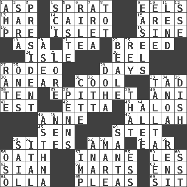 ACROSS 1. Cleo's killer 4. Small fatty European fish 9. Snakelike fish 13. Impair 14. Capital of Egypt 15. Ancient Greek god of war 16. Before (prefix) 17. Small island 18. Trig term 19. White ___ sheet 21. Afternoon social gathering 22. A special lineage 24. Capri or Wight 26. Snakelike fish 27. Cowboy competition 29. 24-hour periods 30. Approach 31. Calm and collected 33. Bit 36. Nine, plus one 37. Curse 40. Black tropical American cuckoo 41. Eastern Standard Time (abbr.) 42. Singer James 43. Rings 45. Singer Murray 47. Assad's deity 48. Elected rep. 49. Proofreading order 50. Locates 52. Wet nurse (var.) 54. Ewer handle 56. Pledge 57. Empty; void 59. French article 61. Thailand, formerly 62. Shops 63. Followers of ems 64. Rounded earthenware pot or jar 65. Entreaties 66. Be seated DOWN 1. Electrical Unit 2. "Two Mules for Sister ____" 3. Elected leader of a country 4. _-fi 5. Thick mixture 6. Cause heat under the collar 7. Length times width 8. Small child 9. Artist's stands 10. 4th largest of the Great Lakes 11. Grant temporary use of 12. Compass dir. 20. Toward the sea 22. Calif. Air Force Base 23. Marina Del _, California 25. Old wives' tales, e.g. 27. Pace 28. Singles 29. Capital of the state of Qatar 31. Quote 32. Baseball player Mel 33. Baron Munchausen's specialties 34. Small Philippine buffalo 35. Food container 38. Actor Sean's family 39. Not this but _ 44. Toward shelter 45. Respiratory problem 46. Born 49. Before Barbara or Clara 50. Travel by water 51. Slanted text style (abbr.) 52. Of or related to the anus 53. Female horse 55. Painter Guido (1575-1642) 56. Bear (Spanish) 57. Mischievous child 58. Double-curved letter 60. Fast jet (abbr.)