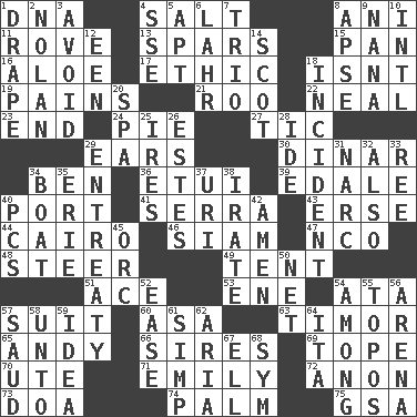 ACROSS 1. Heredity factor (abbr.) 4. Table seasoning 8. Cuckoo 11. Be footloose 13. Practice fights 15. Baking dish 16. _ vera 17. Principle of right and wrong 18. Is not 19. Aches 21. Friend of Pooh 22. Anneal 23. Conclusion 24. Sliced dessert 27. Nervous spasm 29. Hearing organs 30. Middle Eastern gold or silver currency 34. Benjamin's nick name 36. Needle holder 39. Peak District village in England 40. Sweet dark-red dessert wine 41. Father Junipero _ 43. Celtic language 44. Capital of Egypt 46. Thailand, formerly 47. Non-commissioned officer (abbr.) 48. Bull 49. Portable shelter 51. Adept person 53. Compass dir. 54. _ moment's notice (2 wds.) 57. Costume for a special activity 60. White ___ sheet 63. Southeast Indonesia island 65. "60 Minutes" Commentator Rooney 66. Male parents of animals 69. Drink excessively 70. Shoshoni 71. Poet Dickinson 72. At once, immediately (arch.) 73. ___ good deed 74. Inside of hand 75. Girls' org. (abbr.) DOWN 1. Window treatment 2. Pitcher Ryan 3. Prevent from happening 4. Compass dir. 5. Fitting 6. Cowardly lion portrayer 7. Musical group of three 8. Domed church section 9. Grandmother 10. International (abbr.) 12. Car or cant ending 14. Native of Scotland 18. Happening 20. Health resort 25. Angers 26. _____ Park, CO 28. Binary compound 29. Plea 31. Drug cop 32. In addition 33. Portuguese money of account (variant) 34. Water vessel 35. One of the Great Lakes 37. RI univ. 38. Feeling or showing extreme anger 40. Personal Computers (abbr.) 42. So be it 45. The grampus (Milton) 50. Remaining after all deductions 52. Comfort 54. Amid 55. Literary convention 56. Sports stadium 57. Saudi Arabian king (1953-1964) 58. To (old English) 59. It may be bright or harebrained 61. Simple or foolish person 62. Operatic vocal solo 64. Call ___ day 67. Pipe bend 68. Symbol (abbr.)