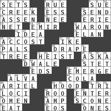 ACROSS 1. Puts into a specified state 5. Sorrow 8. Institute legal proceedings 11. Small stream 13. Curvy letter 14. Post 15. NE Netherlands city 16. Born 17. One of the Great Lakes 18. Remaining after all deductions 19. Independent ruler or chieftain 21. Make _____ (do battle with) 22. The content of cognition 24. Style 25. Buttonhole 27. D.D.E's nickname 29. Friends 30. Window treatment 32. Family _ (genealogy) 33. Robbery 35. "____ silly question..." 39. A sleeping potion; an opiate (poet.) 41. Proofreading order 42. Begley and Asner 43. Develop 45. Inventor's middle name 48. Root beer relative 49. Satellite of Uranus 50. Parka part 52. Three (prefix) 55. Venues 56. Friend of Pooh 57. Keyboard key 59. Sign of things to come 60. Electrical Unit 61. Biscuitlike quick bread 62. Ingest 63. Greek goddess of the dawn 64. Washington bills DOWN 1. Examine hastily 2. Celtic language 3. One of the two male reproductive glands 4. Perceive with the eye 5. Painter Guido (1575-1642) 6. One who uses or employs something 7. Compass dir. 8. Father Junipero _ 9. The state of being joined or united 10. Locale of original sin 12. Leg joints 14. Lick closed 20. Floor protector 21. Shed a tear 23. Administered medicine 25. Fitting 26. Auto 27. Big collection agency 28. Krazy ___ of comics 30. Expire 31. Artist's stand 33. Possessed 34. Raised railways 36. Ski resort town in Vermont 37. Barrel 38. Had dinner 40. Welt 43. Environmental prefix 44. Methods 45. Scent 46. It is permitted: Lat. 47. Distinctive style or manner 49. Medicinal plant 50. Same (prefix) 51. I made a mistake 53. French philosopher Descartes 54. Angers 56. Actress Charlotte 58. Non-commissioned officer (abbr.)