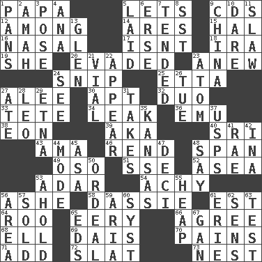 ACROSS 1. Dad 5. Allows 9. Music discs 12. Amid 14. Ancient Greek god of war 15. Actor Linden 16. Rhinal 17. Is not 18. Lyricist Gershwin 19. A female animal or person 20. Dodged 23. Afresh 24. Sever or remove by pinching or nipping 25. Singer James 27. Toward shelter 30. Fitting 32. Superhero pair 33. Wig 34. Path through which fluid escapes 36. Australian flightless bird 38. A really long time 39. Alias (abbr.) 40. _ Lanka 43. Housemaid (var.) 46. Tear apart 48. Connect, as a bridge 49. Bear (Spanish) 51. Compass dir. 52. At sea 53. The sixth month of the Jewish calendar 54. Painful 56. American tennis player Robert 58. Small ungulate mammals of Africa 61. Eastern Standard Time (abbr.) 64. Friend of Pooh 65. Suggestive of the supernatural 66. Match 68. Pipe bend 69. Raised platform 70. Aches 71. Increase 72. Narrow board 73. A home for chicks DOWN 1. Baking dishes 2. Nanny 3. Introduce or present, as a question 4. Santa ___, CA 5. Put down 6. Celtic language 7. Watched over 8. Fast jet (abbr.) 9. Large country 10. Have the gumption 11. Cole _ (cabbage dish) 13. Small, secluded valley 21. Small bottle 22. Become visible 23. Tiny particle 24. Observe 26. Third day of the wk. 27. Had dinner 28. Lion 29. Inactive volcano in Sicily 31. Receives possession of 35. Sunflower state 37. United States Postal Service (abbr.) 41. Actress Charlotte 42. _ tizzy (2 wds.) 44. Method 45. White ___ sheet 47. Tenth: prefix 48. Declare 50. Severe or trying experience 53. Hold, grip (Informal) 55. Pile 56. Length times width 57. Disposed of to a purchaser 59. Operatic vocal solo 60. System (abbr.) 61. 4th largest of the Great Lakes 62. Elected reps. 63. Trial 65. Begley and Asner 67. Separate the seeds from cotton