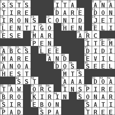 ACROSS 1. Fast planes 5. Call ___ day 8. Santa ___, CA 11. Hoop that covers a wheel 12. Have the gumption 14. Spanish title 15. Metal shackles 17. Continued (abbr.) 18. _ stream 19. Small, flat, pigmented spot on the skin 21. Layer 22. Connecticut Ivy Leaguer 23. Compass dir. 24. Spoil 25. Curve 27. Animal enclosure 28. A whole individual unit 31. Lettered men learn these first 35. Area sheltered from the wind 37. "You Light Up My Life" star Conn 38. Female horse 39. Added to 41. Morally bad or wrong 42. Small Philippine buffalo 43. Two (Sp.) 45. Stitch closed the eyes of (a falcon) 46. Behest 47. Mountains (abbr.) 49. Fast jet (abbr.) 51. Auto club (abbr.) 52. ___ good deed 55. The 23rd letter of the Hebrew alphabet 57. The grampus (Milton) 60. Stimulate to action 62. Sis' sibling 63. Japanese brewing company 65. Echolocation 66. Title for a knight 67. Inky black, to poets 68. Suttee (variant) 69. Groovy apt. 70. Health resort 71. Relationship diagram DOWN 1. Vertical member of a panel or frame 2. Begets 3. Heavy duty weighing machine 4. Transmitted 5. Wedding promise 6. Hyperbolic tangent 7. Johnson of "Laugh-In" 8. Descriptive word 9. Christmas carol 10. Opposed to 13. Pulitzer Prize-winning author Ferber 16. Simple or foolish person 17. Pupil covering 20. Highlander 26. Amusement-park features 29. Singer Brickell 30. Place where flour is made 31. Nanny 32. Object of repulsion 33. What you're doing now 34. Theater features 36. Conclude 40. Kingdom 44. Comedian Laurel of Laurel & Hardy 48. Backtalk 50. Puff or smoke 52. Middle Eastern gold or silver currency 53. Speak pompously 54. Nest on high 55. Cook's measure (abbr.) 56. Operatic vocal solo 58. Teases 59. Riding implement 61. Mail 64. _ tizzy (2 wds.)