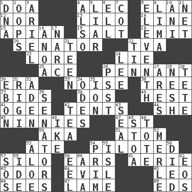 ACROSS 1. ___ good deed 4. Actor Baldwin 8. Flair 12. And not 13. _ and Stitch 14. Actor's bit 15. Bee-related 18. Table seasoning 19. Give off 20. Elected representative 22. Federal power corp. 23. Old wives' tales, e.g. 24. Whopper 25. Adept person 26. Pre-World Series prize 30. Epoch 33. Annoying sound 36. Family _ (genealogy) 37. Auction offers 39. Two (Sp.) 40. Behest 41. Double curve, resembling the letter S 42. Portable shelters 44. A female animal or person 45. Fools 47. Eastern Standard Time (abbr.) 50. Alias (abbr.) 51. Smallest unit of an element 53. Had dinner 54. Manned the helm 57. Grain storage tower 59. Hearing organs 61. Nest on high 63. Aroma 64. Morally bad or wrong 65. Lion 66. Perceives with the eye 67. Unable to walk 68. Begley and Asner DOWN 1. Heredity factor (abbr.) 2. I made a mistake 3. Satellite of Uranus 4. In addition 5. One who doesn't tell the truth 6. Pipe bend 7. Small bed 8. Veterans Day date 9. Pale green bean 10. Black tropical American cuckoo 11. Fish or hair follower 16. Small Philippine buffalo 17. Drug cop 21. Adolescent 22. Shallow baking pan 24. Area sheltered from the wind 26. Inconspicuous attention getter 27. Ancient Greek god of war 28. Tender 29. False hair 30. Inky black, to poets 31. Swiss mountan, "Queen of the Mountains" 32. An important port of Yemen 34. Lyric poems 35. Electrically charged atom 38. Legislators 42. Afternoon social gathering 43. Lick closed 46. D.D.E's nickname 48. Portico 49. Lug 52. Haggard of country music 53. _ vera 54. Demure 55. Capri or Wight 56. Passed on 57. Distress signal 58. Binary compound 59. Snakelike fish 60. Actress Gardner 62. Greek goddess of the dawn