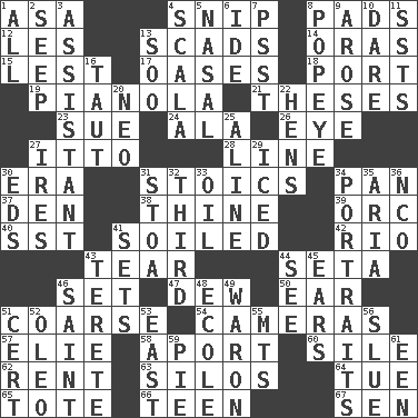 ACROSS 1. White ___ sheet 4. Sever or remove by pinching or nipping 8. Groovy apts. 12. French article 13. Tons 14. Mouths or openings 15. For fear that 17. Fertile tracts in a desert 18. Sweet dark-red dessert wine 19. Player piano 21. College papers 23. Institute legal proceedings 24. Chicken ___ king 26. Sight organ 27. "Tell ____ the Marines!" 28. Actor's bit 30. Period 31. Unemotional ones 34. Baking dish 37. Lair 38. One or ones belonging to thee 39. The grampus (Milton) 40. Fast jet (abbr.) 41. Dirtied 42. River (Sp.) 43. Lacerate 44. Bristle 46. Put into a specified state 47. Morning condensation 50. Ewer handle 51. Rough 54. Devices for capturing images 57. Writer Wiesel 58. To the left, to Queeg 60. Drop; flow; fall 62. Monthly bill 63. Grain storage towers 64. Third day of the wk. 65. Lug 66. Adolescent 67. Elected rep. DOWN 1. Everything 2. Ooze 3. Aide 4. Any of the three canals of the cochlea 5. Rhinal 6. Binary compound 7. Inconspicuous attention getter 8. Wimpy's pal 9. Came up 10. Have the gumption 11. Fast planes 13. "Barney Miller" actor Jack 16. Strained 20. Modern: prefix 22. Coop moms 25. Place in a line 27. Angers 29. On the rocks 30. Begley and Asner 31. Portico 32. One of three equal parts 33. Petroleum 34. Likenesses of persons 35. Roberta Peters solo 36. Non-commissioned officer (abbr.) 41. Puts into a specified state 43. Cigar-shaped 44. Observe 45. Hearing organs 46. Inhabitant of Heaven 48. Learning spot: Fr. 49. Make _____ (do battle with) 51. Certainty 52. Margarine 53. Compass direction 55. Mountains (abbr.) 56. Change direction abruptly 59. Sliced dessert 61. Car or cant ending