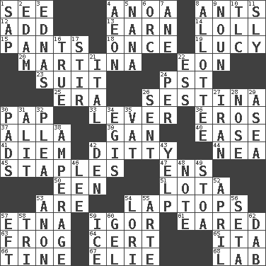 ACROSS 1. Observe 4. Small Philippine buffalo 8. Pismires 12. Find the sum of 13. Merit 14. Hang loosely or laxly 15. Leg coverings 18. Single time 19. "I Love _" 20. Chrissie's court nemesis 22. A really long time 23. Set or collection 24. Pacific Standard Time (abbr.) 25. Epoch 26. French poetic form 30. Infant food 33. Crowbar 36. Greek god of love 37. Silent film actress Nazimova 39. Separate the seeds from cotton 40. Relaxation 41. South Vietnam president (1954) 42. Simple song 44. Teachers' org. 45. Paper fasteners 47. Followers of ems 50. Car or cant ending 51. Globular water bottle used in Asia 53. "We ___ not amused" (Victoria) 54. Portable computers 57. Inactive volcano in Sicily 59. Composer Stravinsky 61. Having ears or earlike features 63. Toadlike animal 64. An absolute certainty 65. Call ___ day 66. Prong on a fork 67. Writer Wiesel 68. Experiment locale DOWN 1. Plant excrement 2. Dutch treat 3. Ferber et al. 4. Period of immesurable duration 5. Grandmother 6. The grampus (Milton) 7. A saturated hydrocarbon 8. One to whom something is allotted 9. Part of speech 10. Affectionate concern, for short 11. Cunning 16. Loyal 17. Agitate 21. Slanted text style (abbr.) 22. Curvy letter 24. For each 26. Transmitted 27. SW Asia republic 28. Olfactory organ 29. Toward the sea 30. Groovy apts. 31. Set down 32. Entreaty 34. Armor plate that protects the chest 35. Large container 38. Electrical Measurement 42. Lair 43. Sharp bark 46. Area sheltered from the wind 48. Make mention of 49. Portico 52. Showery time 53. Soon (poet.) 54. Australian parrot (variant) 55. Johnson of "Laugh-In" 56. Bristle 57. Lizard (obsolete) 58. Three (prefix) 59. Frozen water 60. Set 62. Pat or tap gently