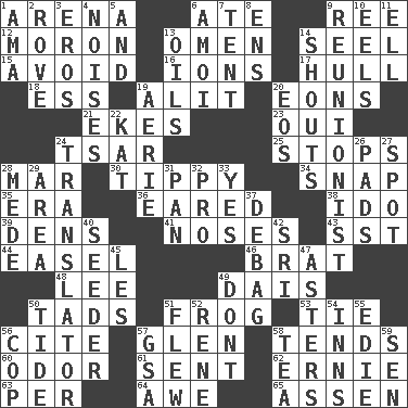 ACROSS 1. Sports stadium 6. Had dinner 9. To riddle 12. Person of subnormal intelligence 13. Sign of something about to happen 14. Sew up the eyelids of hawks and falcons 15. Prevent from happening 16. Charged atoms 17. Frame or body of a ship 18. Double-curved letter 19. Came down and settled, as after flight 20. Immeasurably long periods of time 21. Makes supply last 23. Fr. "Yes" 24. Russian ruler of old 25. Constricts 28. Make imperfect 30. Likely to tip or tilt 34. Fastener 35. Epoch 36. Having ears or earlike features 38. Wedding promise 39. Lairs 41. Olfactory organs 43. Fast jet (abbr.) 44. Artist's stand 46. Naughty child 48. Area sheltered from the wind 49. Raised platform 50. Small amounts or degrees 51. Toadlike animal 53. Standoff 56. Quote 57. Small, secluded valley 58. Looks after 60. Scent 61. Emitted 62. Bert's buddy 63. For each 64. Deep reverence 65. NE Netherlands city DOWN 1. Nursemaid (var.) 2. Be footloose 3. Greek god of love 4. Annoying sounds 5. Also 6. Mine, in Marseilles 7. Portable shelter 8. Followers of ems 9. One who advocates reunion 10. Snakelike fish 11. Pipe bend 13. Petroleums 14. Yells 19. Nest on high 20. Greek goddess of the dawn 22. Krazy ___ of comics 24. Interpreter 26. Writing tablets 27. Blemish 28. Ancient Persian 29. Length times width 31. Baking dish 32. Adept person 33. Consenting reply 37. Debunk (Brit. slang) 40. Sowing specialist 42. Indian title of respect (Mr.) 45. French article 47. Michaelmas daisies 49. Do not 50. Periodic rise and fall of the sea level 51. Soared 52. French philosopher Descartes 54. Restaurants 55. Singer Brickell 56. Police officer (slang) 57. Girls' org. (abbr.) 58. Afternoon social gathering 59. Elected rep.